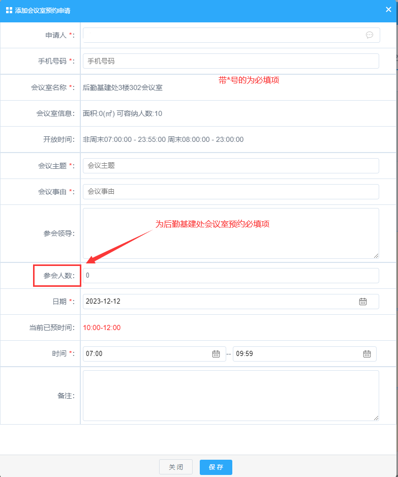 (三)、按照列表,填写相应的栏目,带*号的是必填栏目,太阳集团tyc138的会议室预约必须填写参会人数(如下图)。