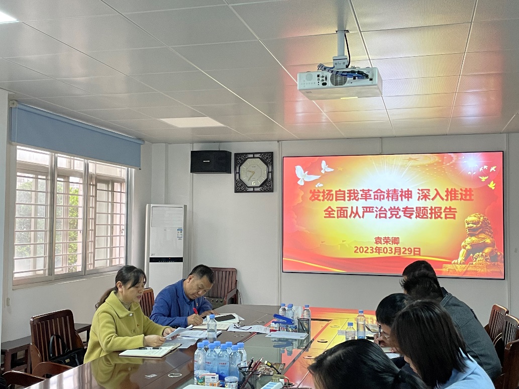 会上,全体人员观看广西纪检监察电视专题片《清廉建设 勇毅前行》第一集《高压惩治腐败》,袁荣卿副书记领学习近平总书记在二十届中央纪委二次全会上的重要讲话,同时作《发扬自我革命精神,深入推进全面从严治党》专题报告。