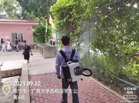 9月7日至9月21日进行一轮登革热防控消杀工作,对人员密集的教学、办公场所、学生公寓区、教工住宅区以及绿化带和全校的其他区域全面进行集中灭蚊,室内采用超低容量喷雾迅速杀灭成蚊,外环境采用绿篱技术对校园内乔木、灌木、绿化带、杂物堆等进行药剂喷洒形成有效隔离带,对防治范围内的蚊类有良好的杀灭效果,对校园内各类小型水体,如下水道、排水沟、雨水井、坑洼积水等各类积水污水投放倍硫磷杀蚴剂杀灭蚊蚴,有效降低蚊虫密度。