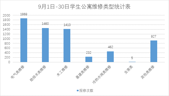 2023年9月份后勤服务24小时报修中心接电话报修、网上报修、现场报修9702单,其中,学生公寓报修6368单(已完工6366单,完工率99.9%,余2单在维修中,其中,电气类1869单,木工类1413单,给排水类1460单,基建类232单,冷热水阀类462单,虫害类5单,其他类927单),余下3334单由其他岗位负责完成维修;在做好每天日常维修的同时,坚持对学生公寓183间电表房,2个水泵房每天巡检。