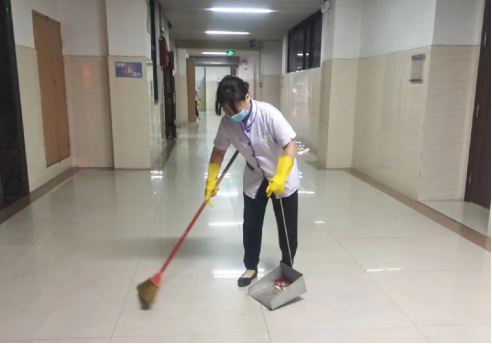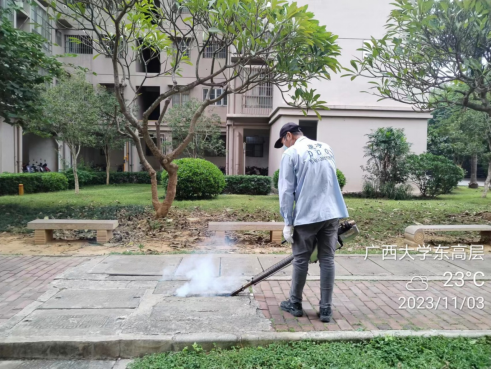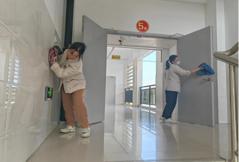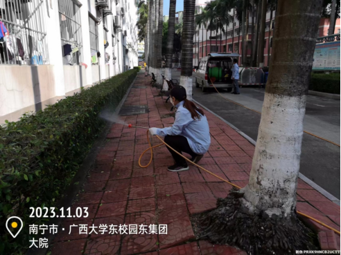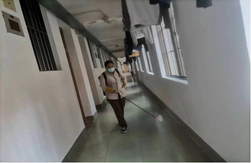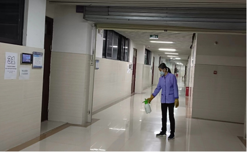 工作人员开展学生公寓楼栋公共区域消毒消杀工作
