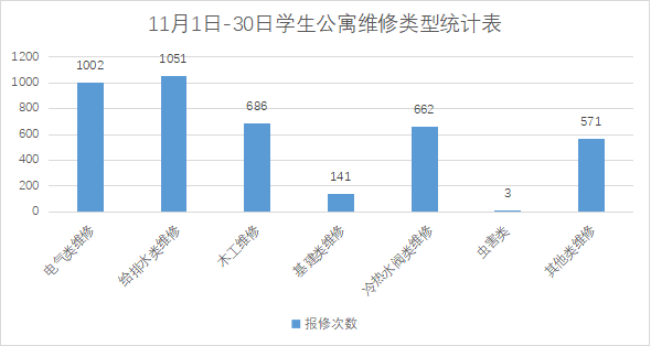 2.日常维修、报修情况。2023年11月份后勤服务24小时报修中心接电话报修、网上报修、现场报修5435单,其中学生公寓报修4116单(已完工4113单,完工率99.9%,余3单在维修中,其中电气类1002单,木工类686单,给排水类1051单,基建类141单,冷热水阀类662单,虫害类3单,其他类571单),余下1319单由其他岗位负责完成维修。