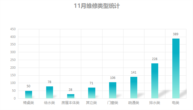 3.本月公共楼宇小型维修共接单1091单,其中电类389单,给水类78单,门窗类106单,排水类228单,疏通类141单,房屋本体类28单,桌椅类50单,其他类71单,完成1062单。