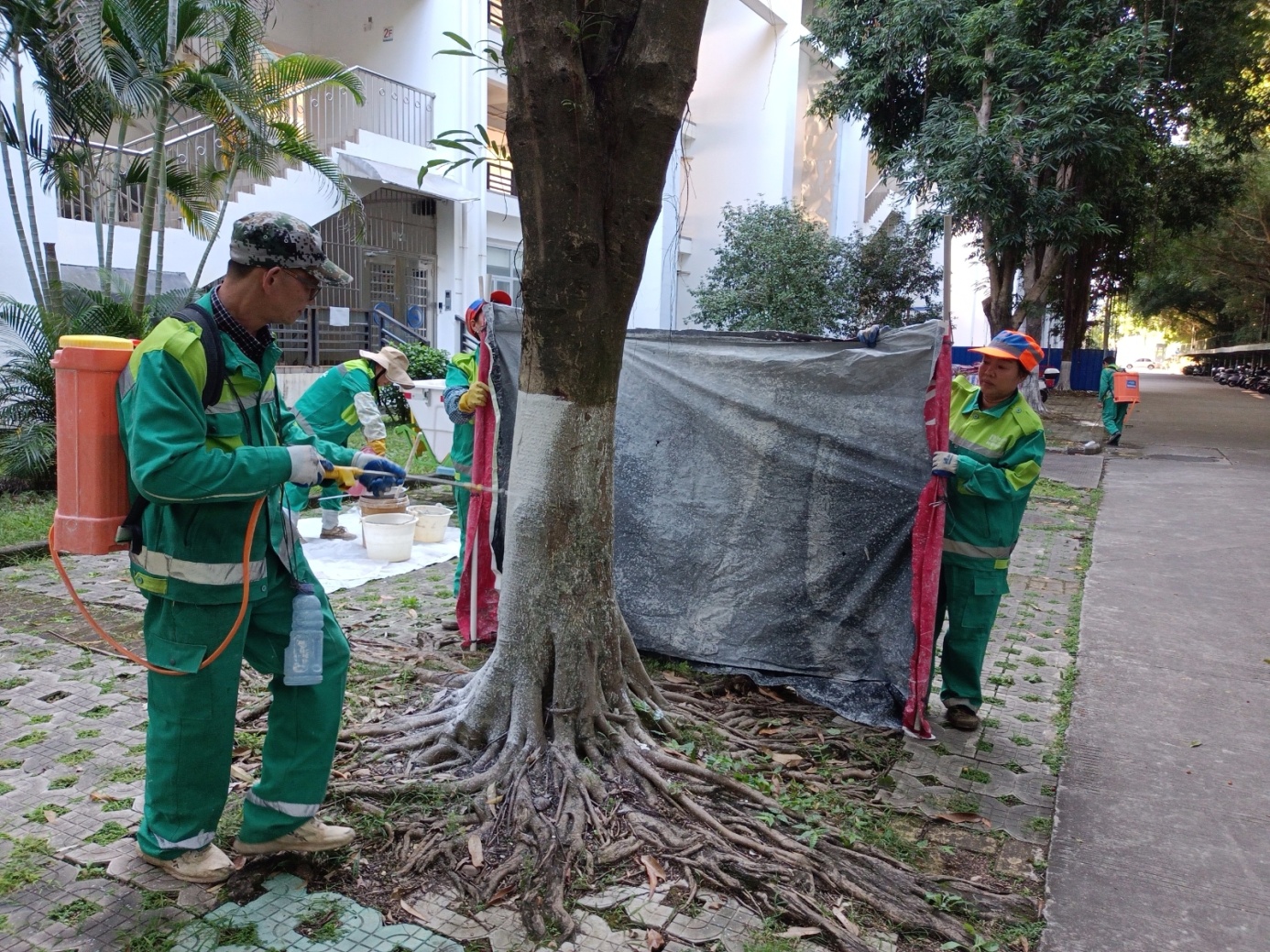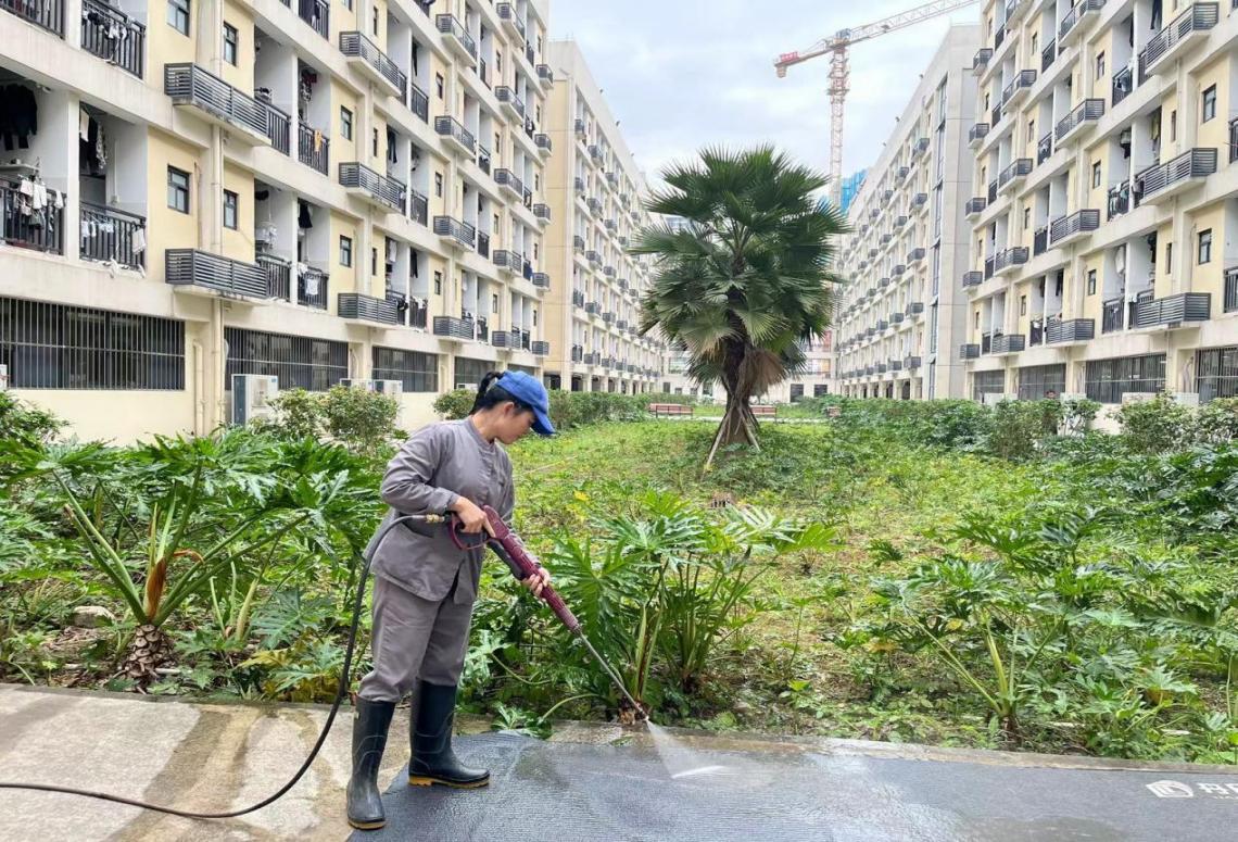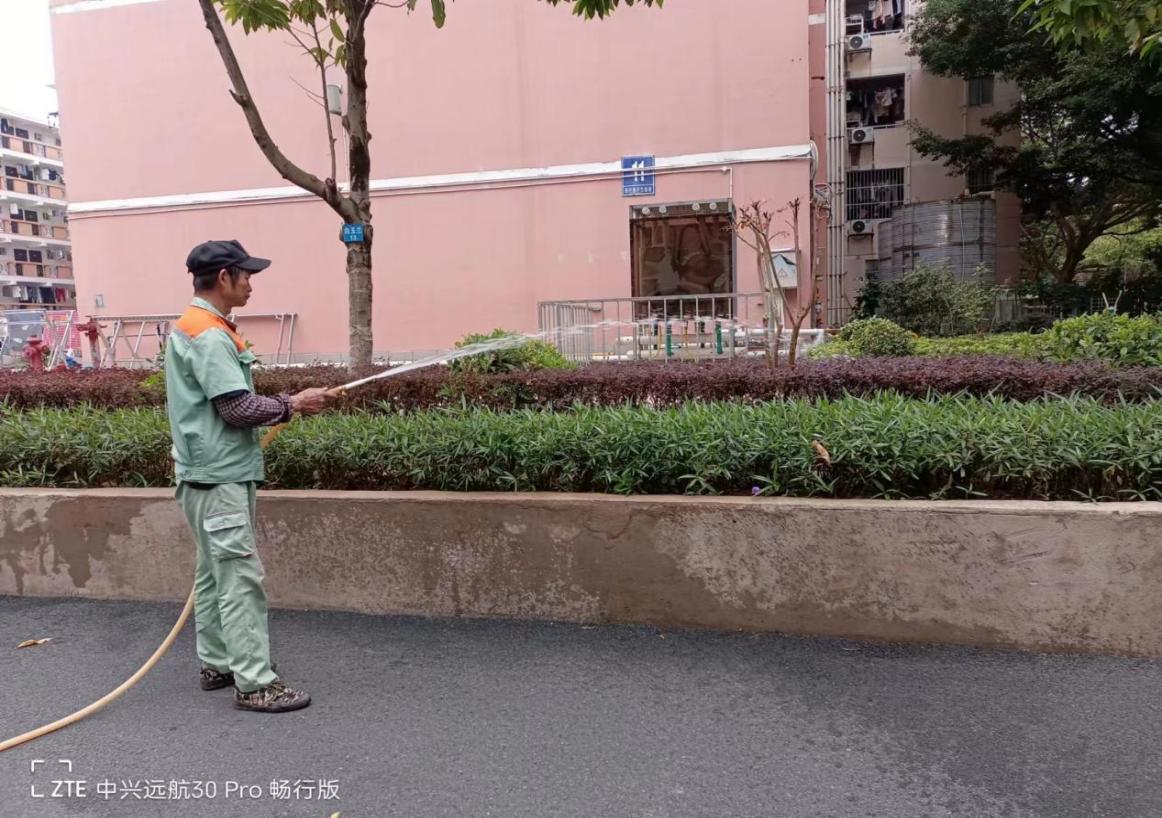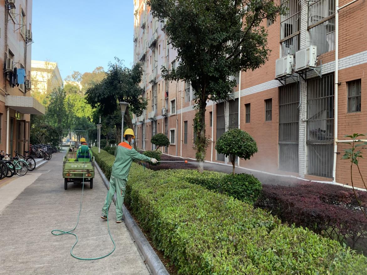 1. 绿化日常修剪养护工作:本月完成学生公寓园区绿化除杂草工作约20000平方米,修剪绿化带面积约14000平方米,绿化带消杀面积约8.3万平方米,冲洗路面约12000平方米。