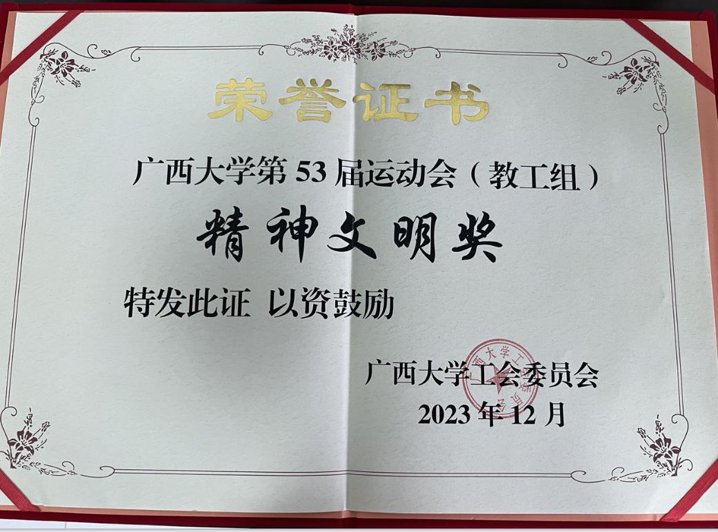 (二)12月8日至9日,我校第五十三届运动会在西校园体育场举行,太阳集团tyc138全体教职工踊跃参与各项运动比赛,在赛场上大家挑战极限,挥洒汗水,享受比赛的乐趣,荣获太阳集团tyc138第53届运动会(教工组)精神文明奖荣誉证书。
