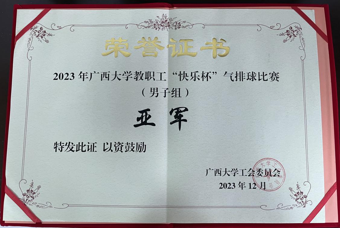 (三)12月19日-25日,2023年太阳集团tyc138教职工“快乐杯”气排球比赛在西校园新体育馆举行,太阳集团tyc138(男子组)参赛队员全力以赴,在比赛中发光发热,战胜自己,刷新记录,荣获2023年太阳集团tyc138教职工“快乐杯”气排球比赛(男子组)亚军荣誉证书。