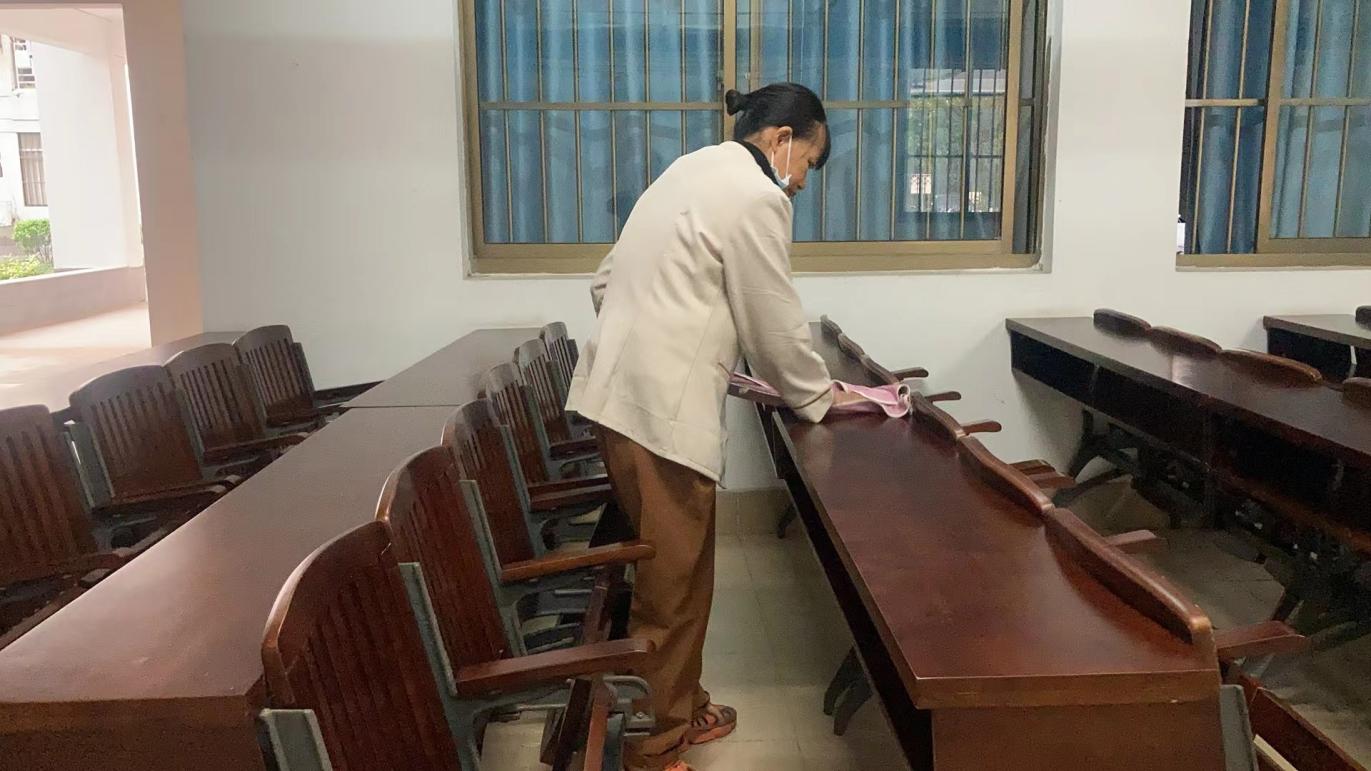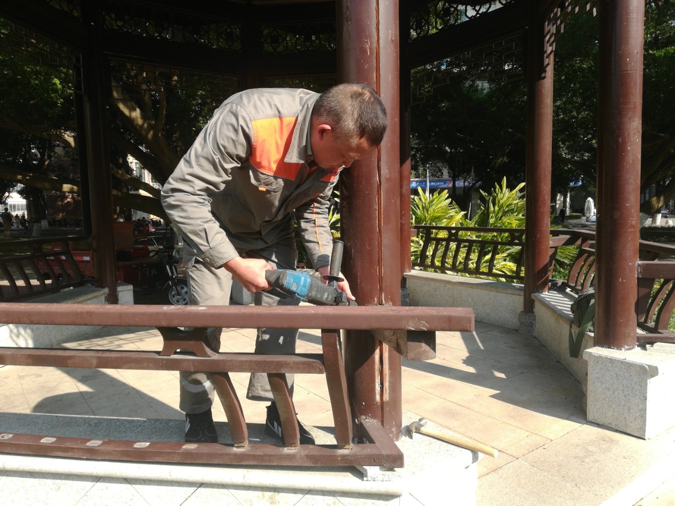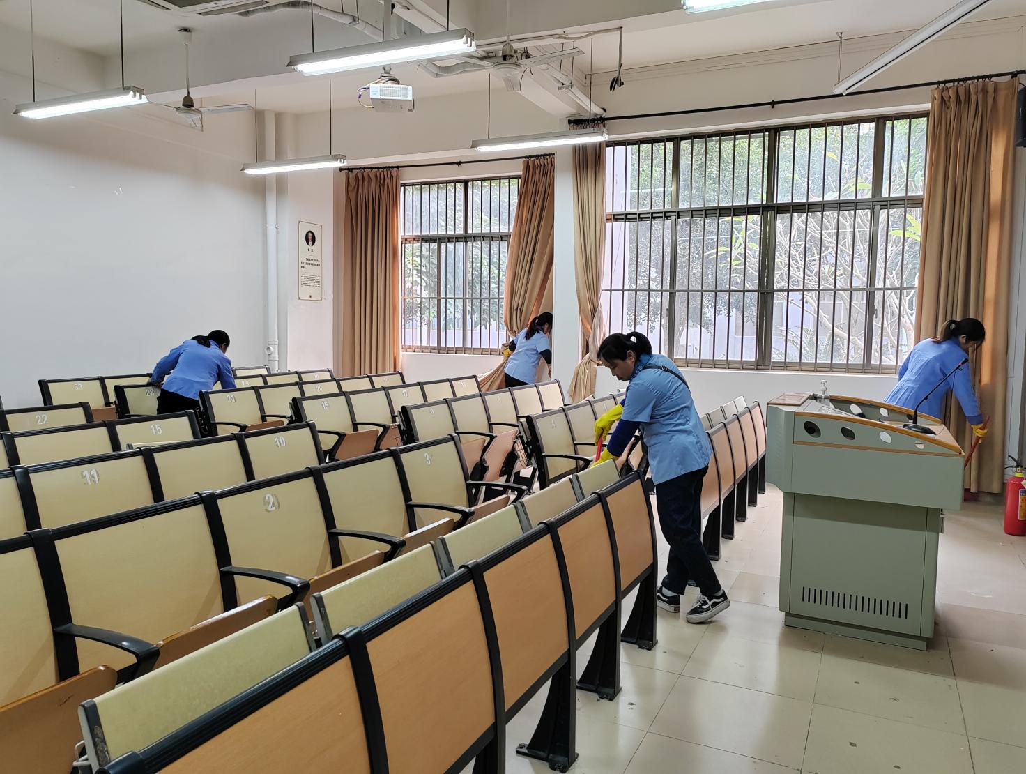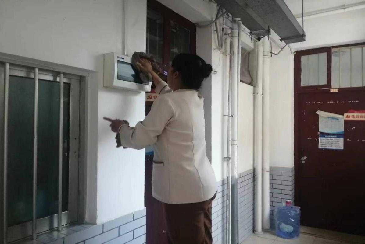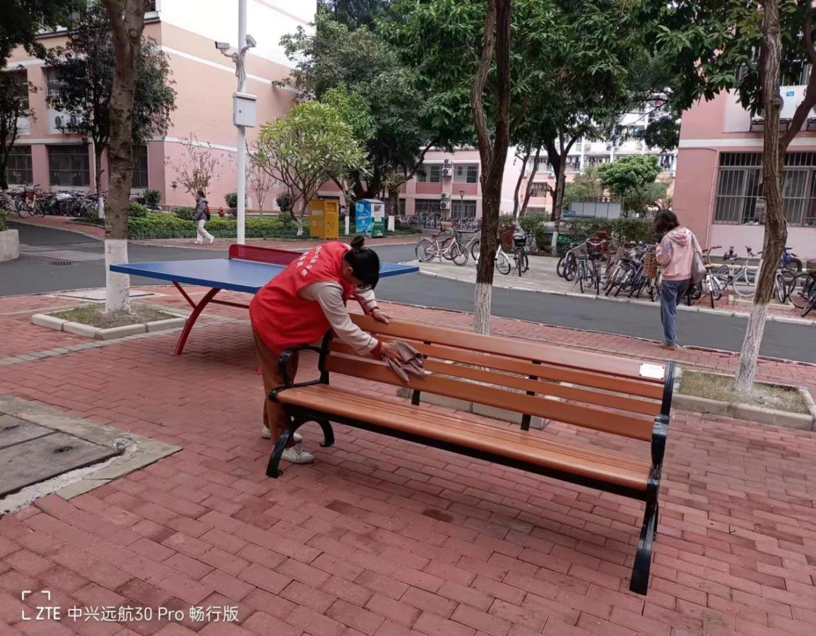 认真做好学生公寓园区内各种设备设施的保洁维护工作,擦拭学生公寓园区内472个生活设施(其中公共长椅102张,乒乓球桌152张,晾衣架 134 个、健身器材84个)和33间自习室。
