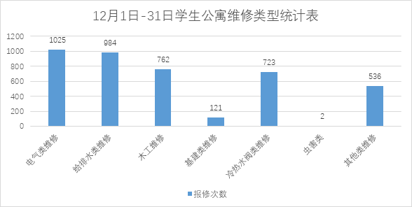 2.日常维修、报修情况:2023年12月份后勤服务24小时报修中心接电话报修、网上报修、现场报修5513单,其中学生公寓报修4153单(已完工4151单,完工率99.9%,余2单在维修中,其中电气类1025单,木工类762单,给排水类984单,基建类121单,冷热水阀类723单,虫害类2单,其他类536单),余下1360单由其他岗位负责完成维修。