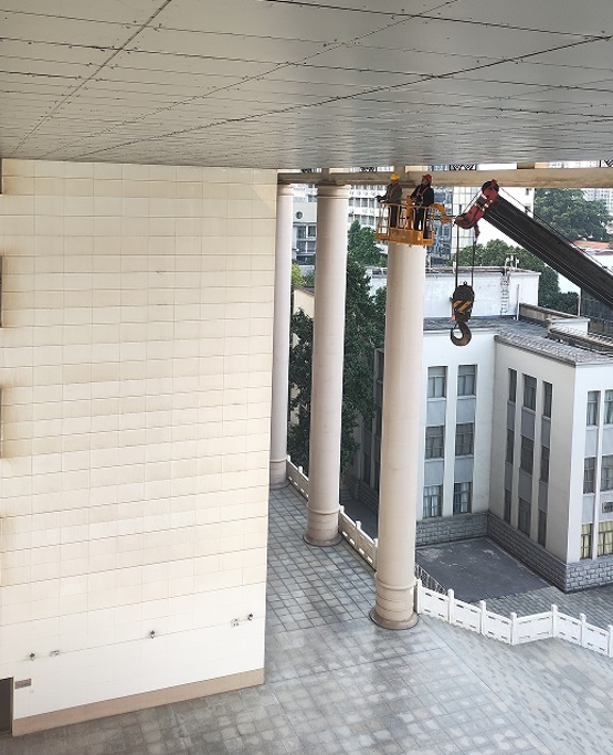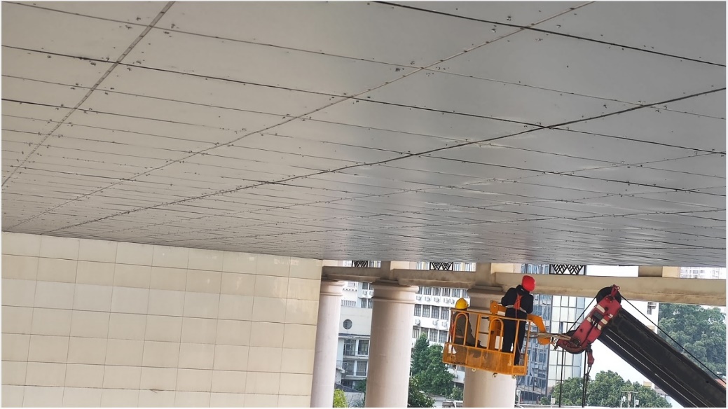 项目概况:综合实验大楼中庭高度约21米,吊顶面积约1500平方米,中庭吊顶的铝塑板有脱落、松动和鼓包现象,存在较大安全隐患。