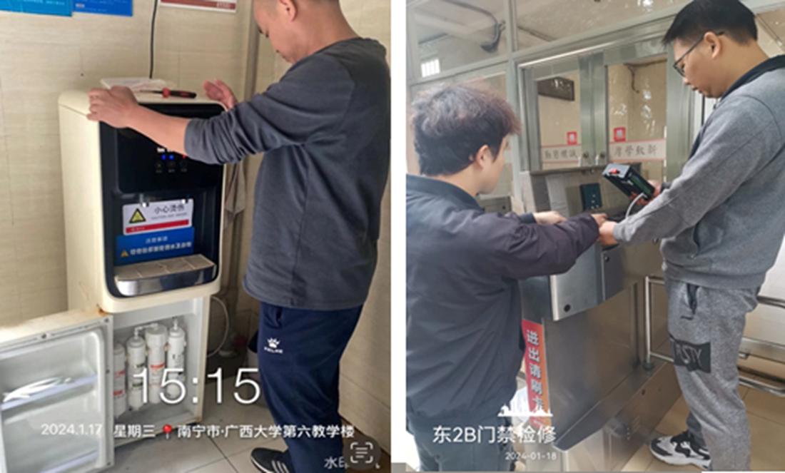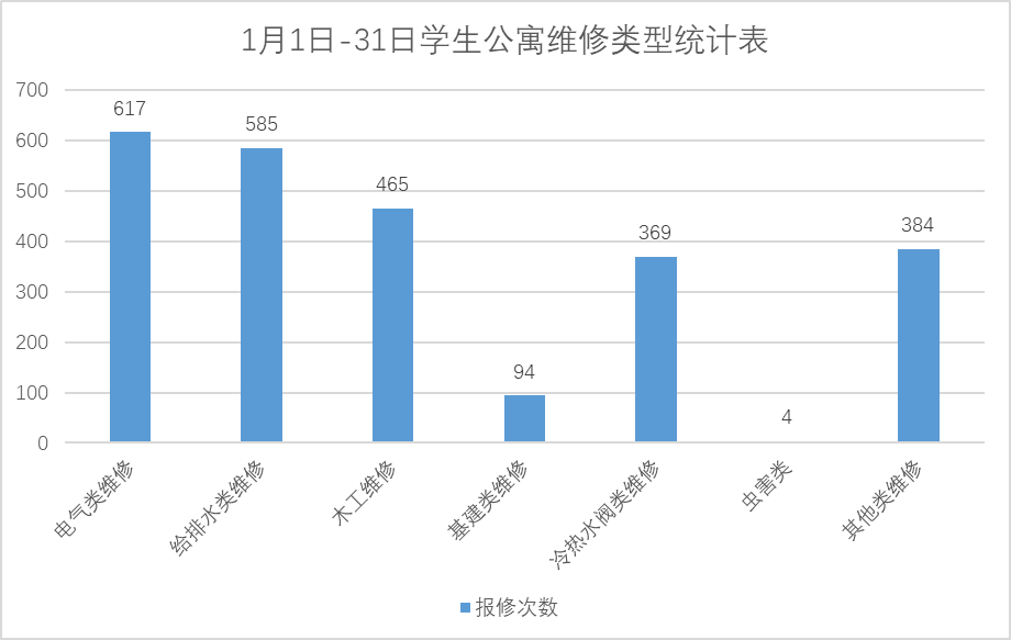 2. 日常维修、报修情况:2024年1月份后勤服务24小时报修中心接电话报修、网上报修、现场报修3423单,其中学生公寓报修2518单(已完工2516单,完工率99.9%,余2单在维修中,其中电气类617单,木工类465单,给排水类585单,基建类94单,冷热水阀类369单,虫害类4单,其他类384单),余下905单由其他岗位负责完成维修。