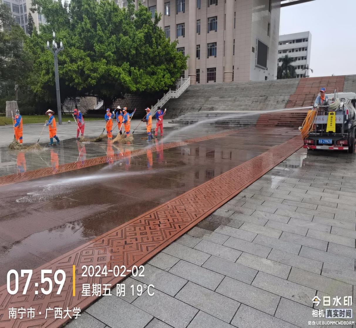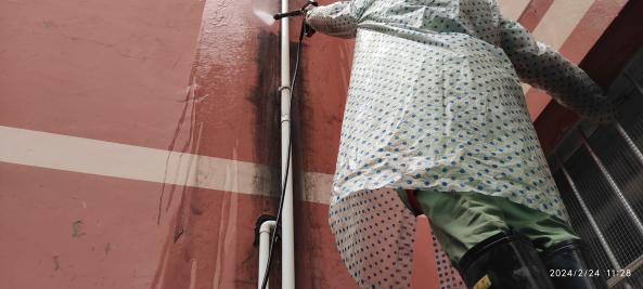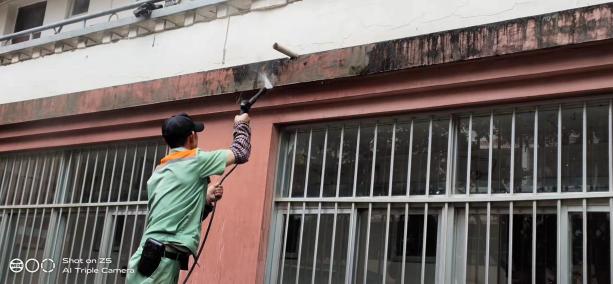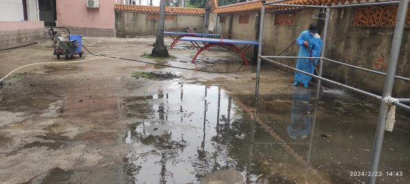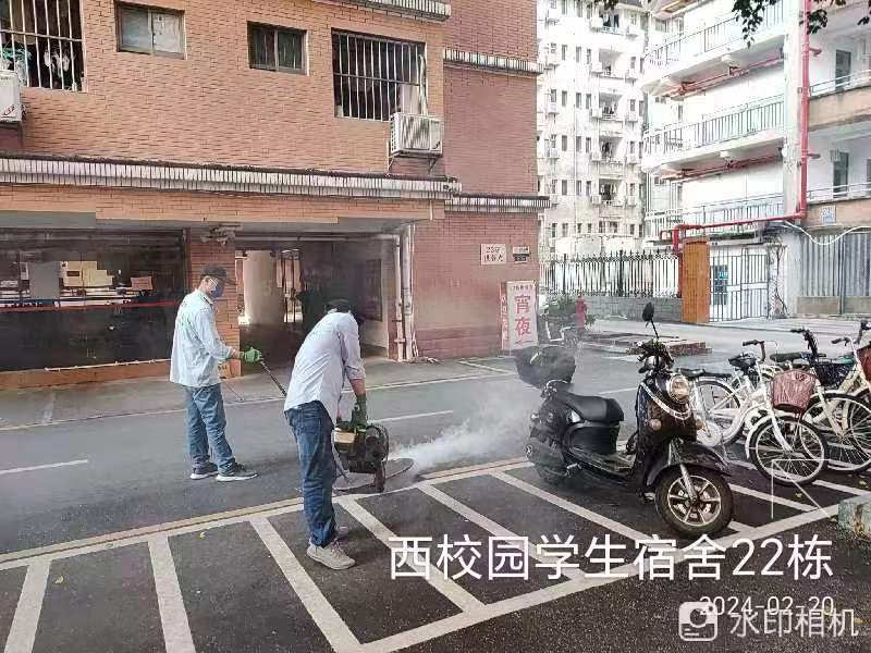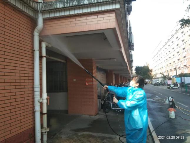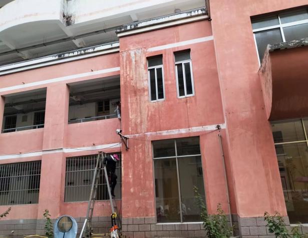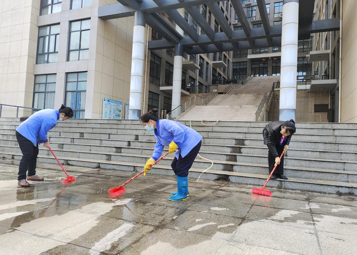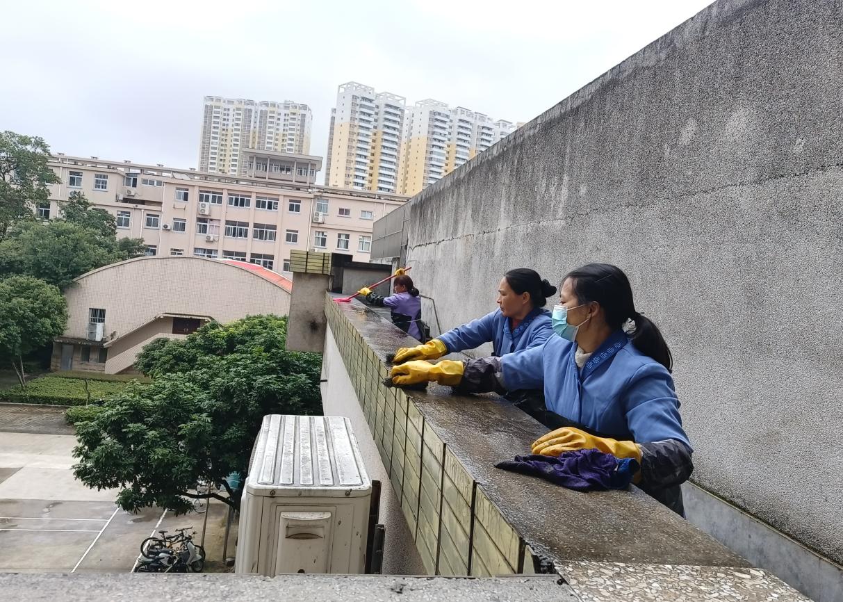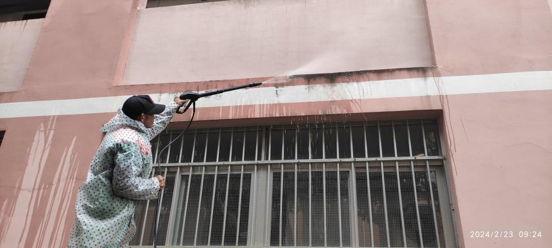 开学前楼栋保洁、清洗学生公寓园区路面、墙面
