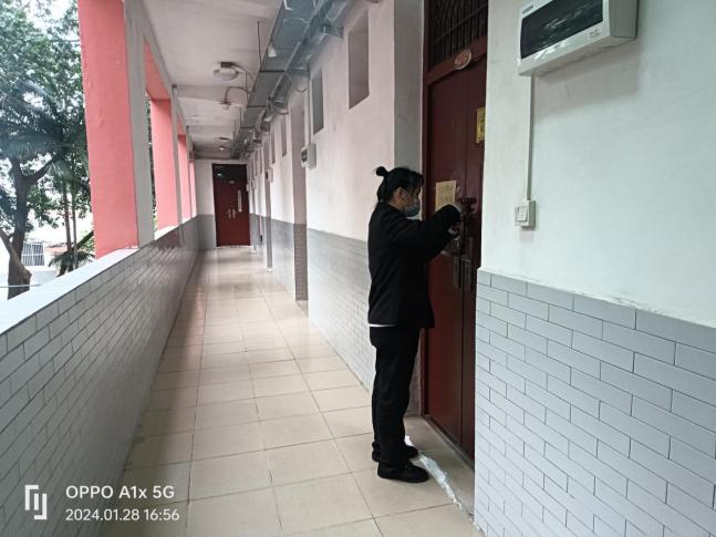 1.寒假期间学生公寓严格落实假期学生公寓楼栋安全巡查工作,在假期前、假期中、开学前结合学生公寓的实际情况,工作人员逐一对围墙、高大树木、门窗、水电设施、消防设施设备等展开了一系列的安全检查工作,并做好工作巡查与记录。