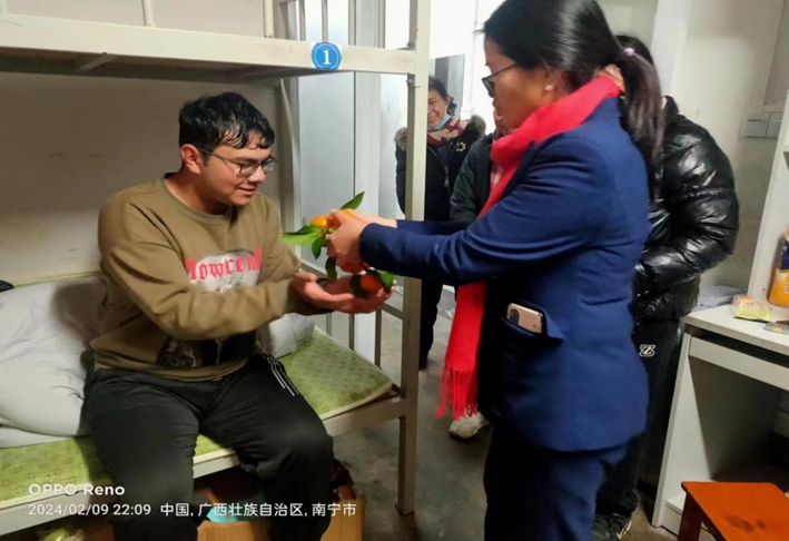 工作人员走访留宿学生,询问学生的假期需求,关切留宿学生的学习与生活,让学生在学校感受到家一样的关怀。除夕夜,工作人员到西28栋走访慰问留宿学生,赠送水果并送上新春的祝福。