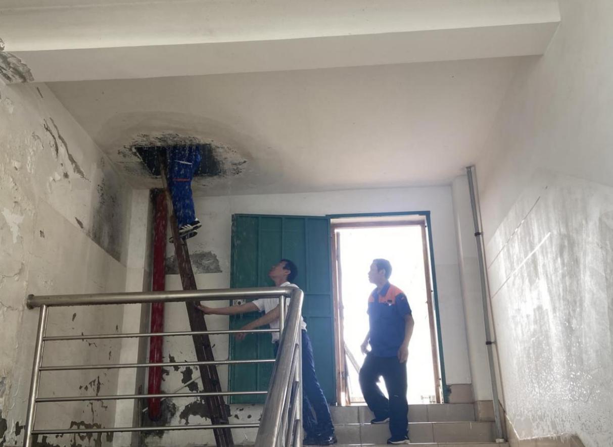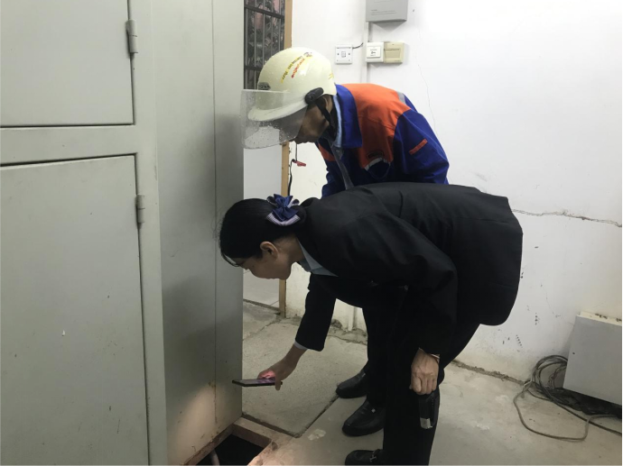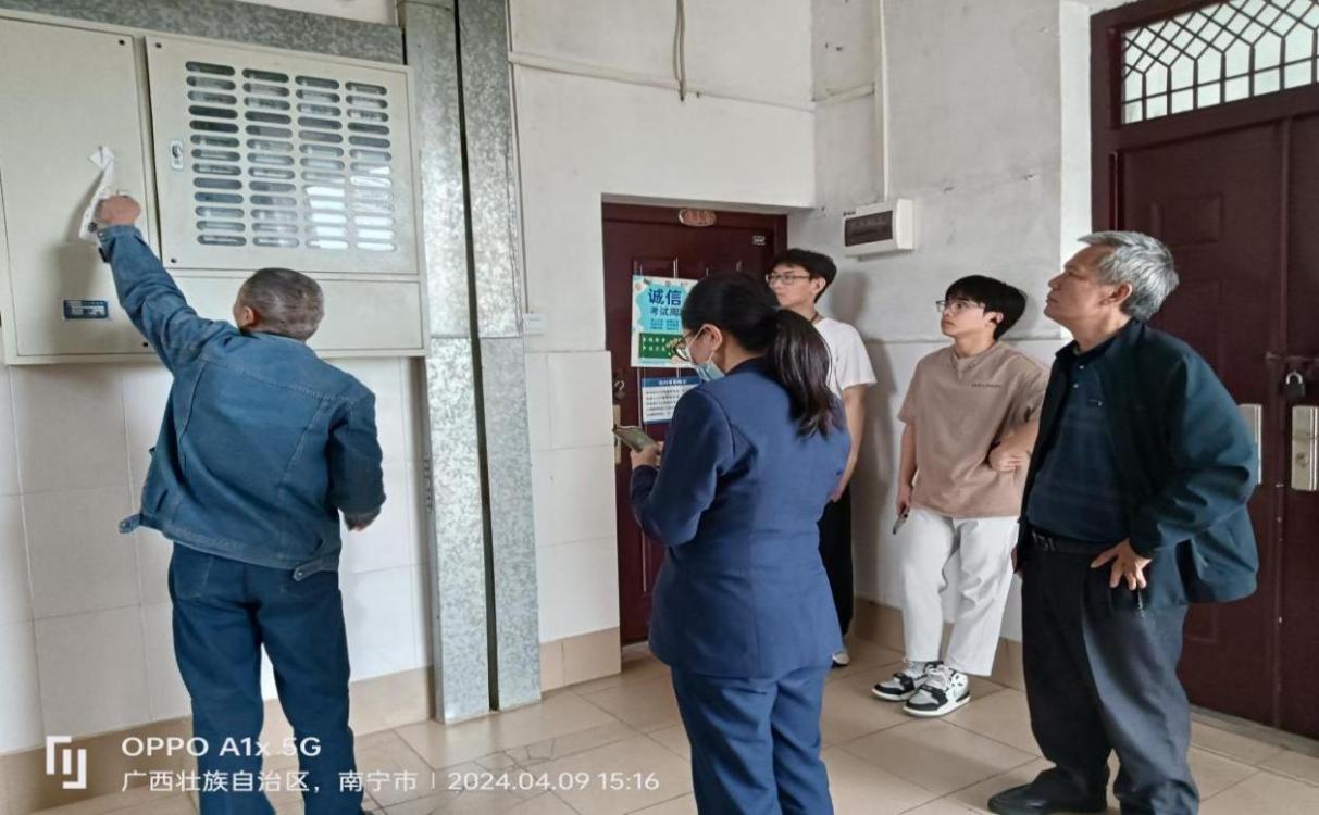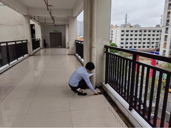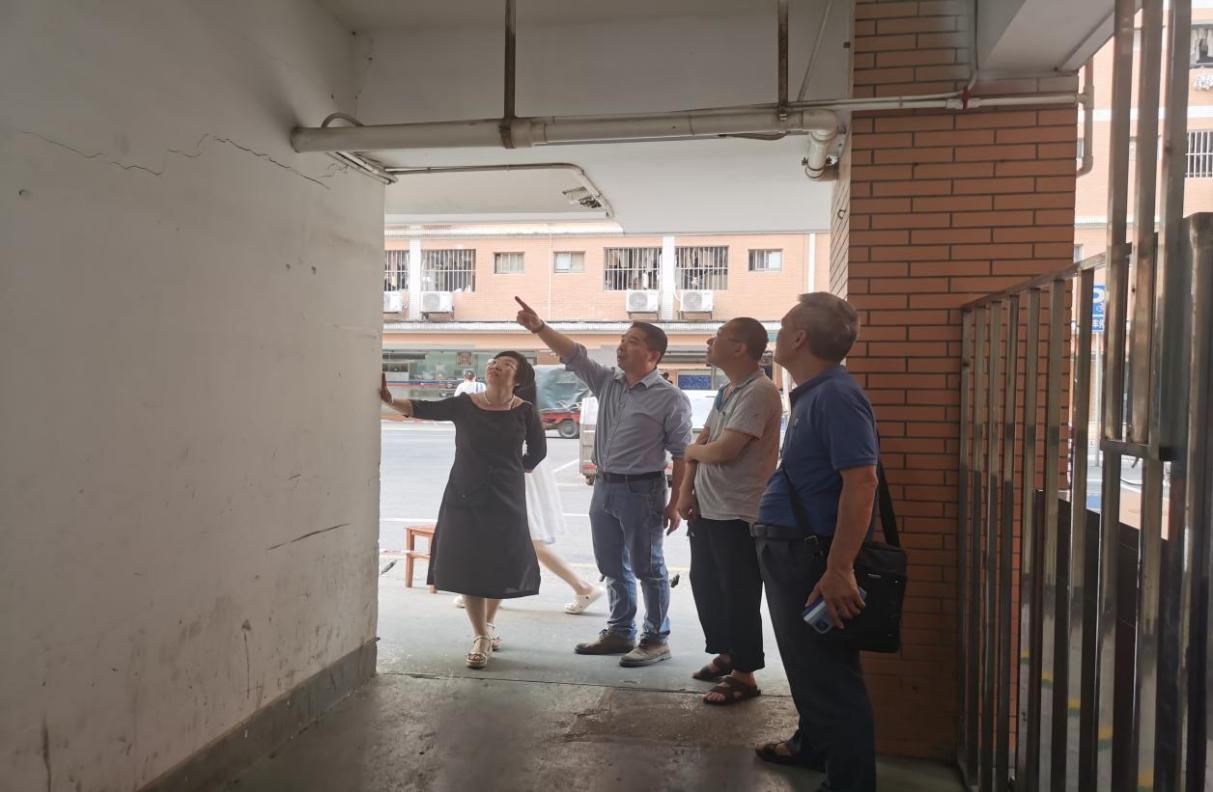 工作人员现场查看西23栋3号通道外墙开裂情况