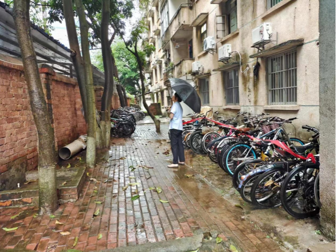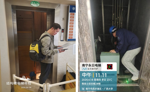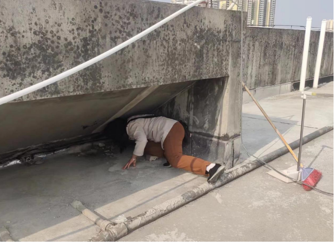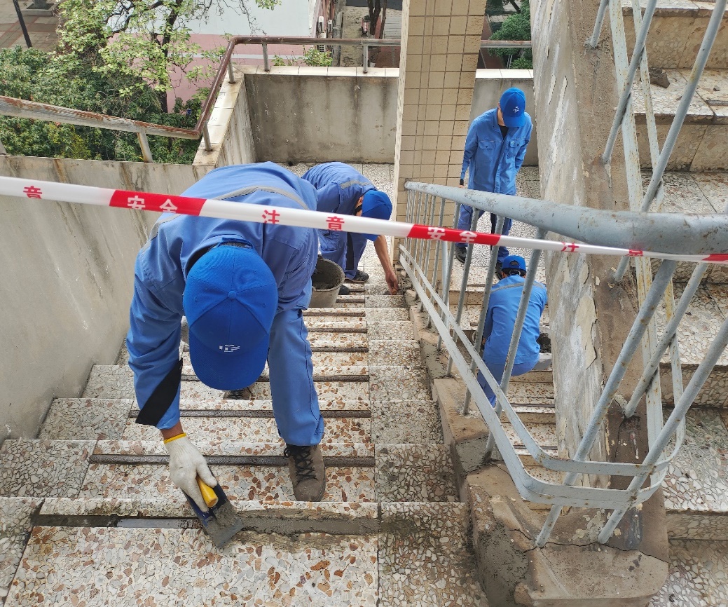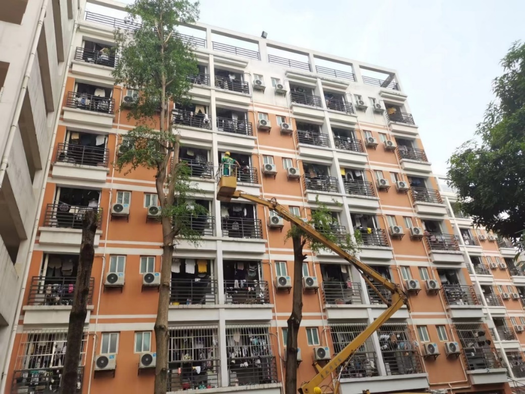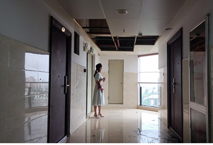 工作人员现场查看西23栋3号通道外墙开裂情况