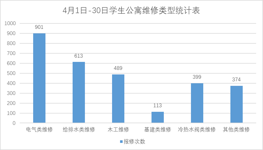 2.日常维修、报修情况:2024年4月份后勤服务24小时报修中心接电话报修、网上报修、现场报修4715单,其中学生公寓报修2889单(已完工2888单,完工率99.9%,余1单在维修中,其中电气类901单,木工类489单,给排水类613单,基建类113单,冷热水阀类399单,其他类374单),余下1826单由其他岗位负责完成维修。