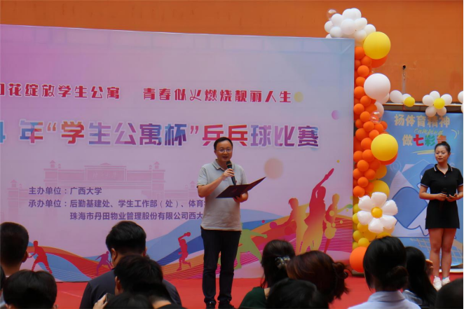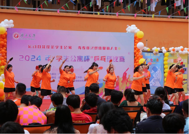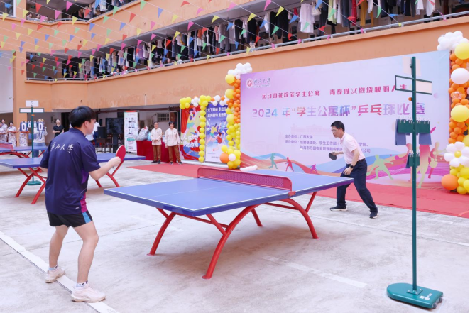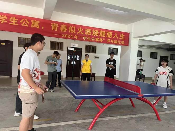 1.为全面深化“三全育人”建设,构建德智体美劳“五育并举”人才培养体系,丰富学生的课余文化生活,营造健康向上的公寓文化氛围,在学生公寓各园区开展2024年“学生公寓杯”乒乓球赛主题活动。5月14日,在学生公寓东22-23栋园区举行首届“学生公寓杯”乒乓球比赛开幕式,校党委常委、副校长宁旭初出席活动并参加开球仪式,约300人参加活动。