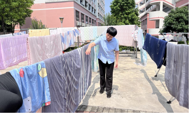 宿管阿姨晾晒同学们的被子