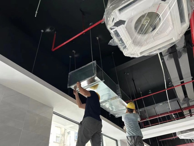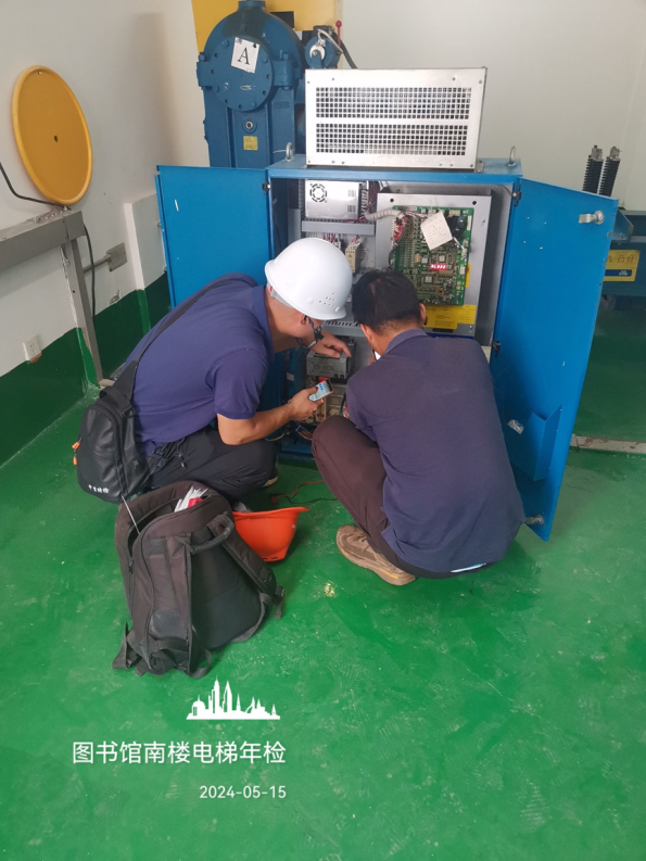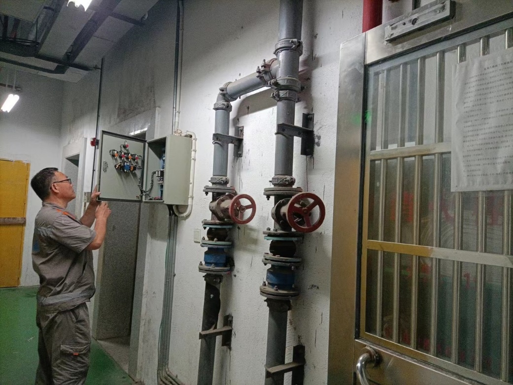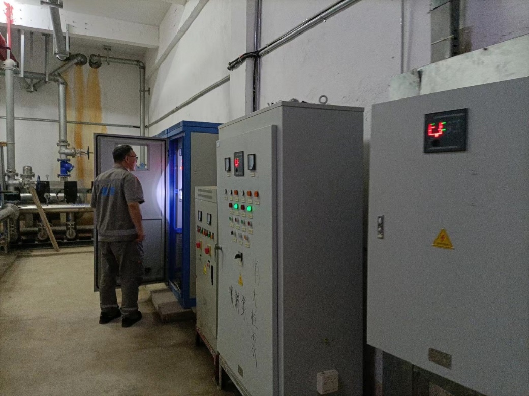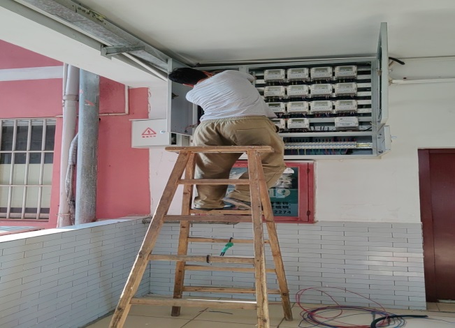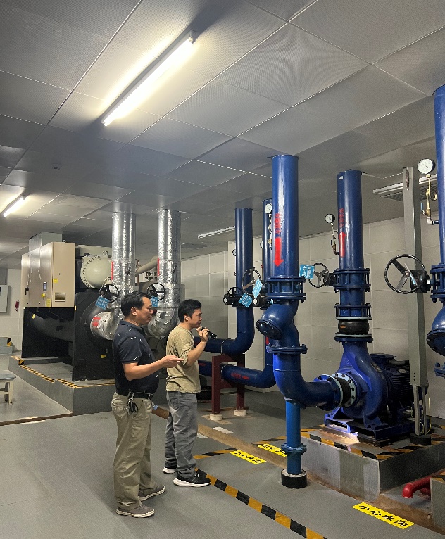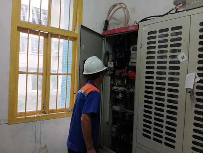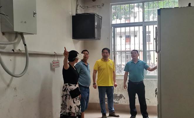 工作人员现场查看学生公寓配电房安装空调情况