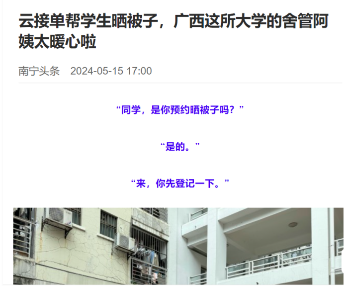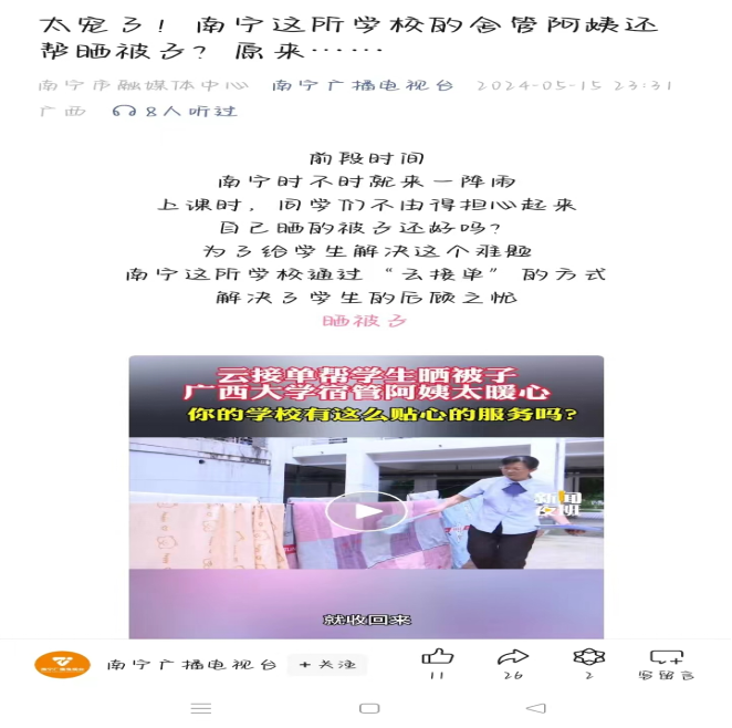 2.暖心服务:为改善学生们的生活条件,保障学生的身体健康,营造温馨的公寓氛围,增进与学生之间的交流和情谊,学生公寓推出“不负春光,暖心晒被”活动,宿管阿姨设晾晒专场,上门服务,给同学们晾晒被子。同学们纷纷响应,5月6日-5月17日,共计接到同学们报名晒被子662单。得到南宁广播电视台、南宁头条的报道宣传。