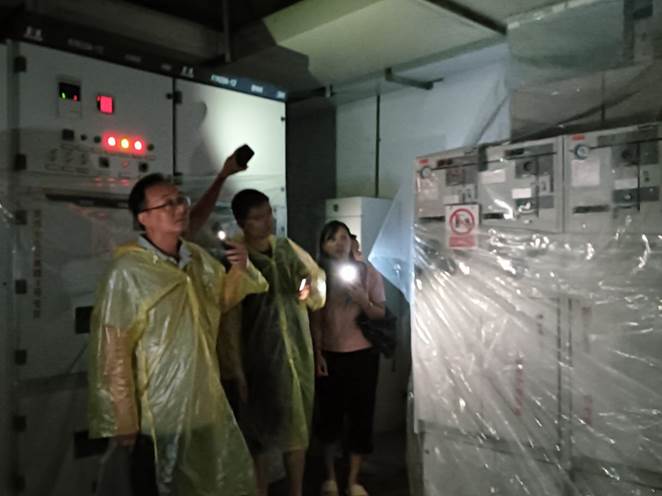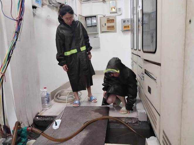 工作人员查看暴雨后东13栋电房进水情况