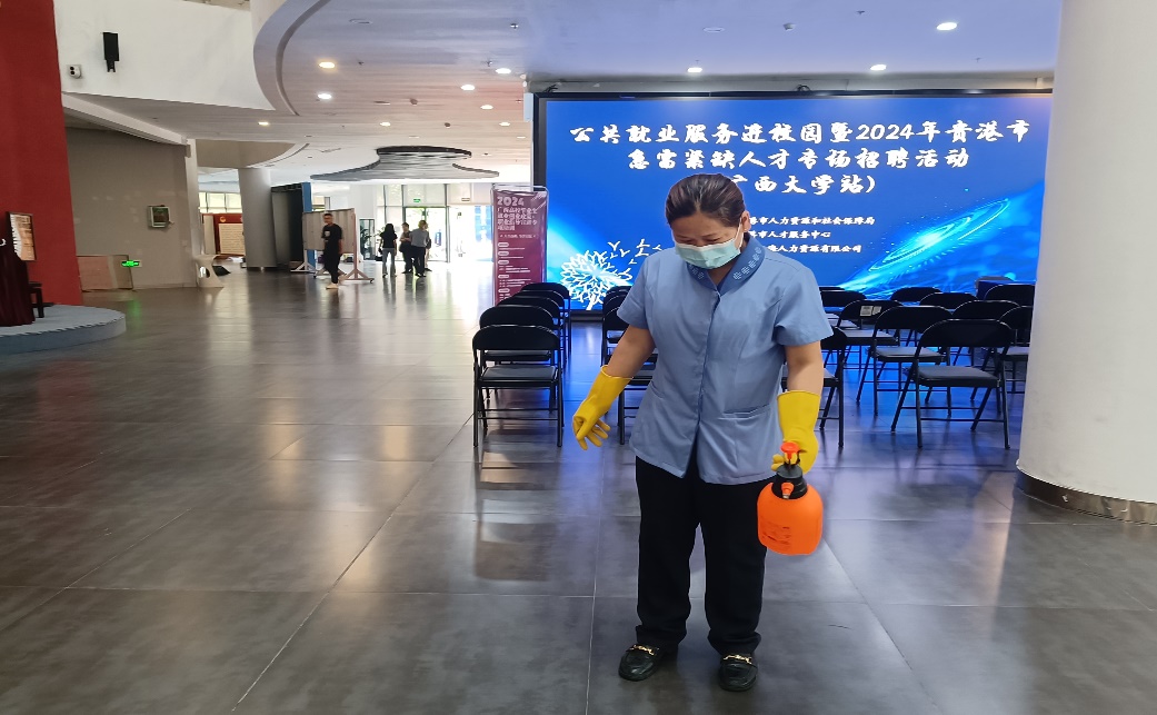 5.做好公共就业服务进校园暨2024年贵港市急需紧缺人才专场招聘活动(广面大学站)现场卫生消毒保障工作。
