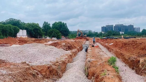 钓月台西侧道路目前已完成电力管道,给水管道,雨水管道的开挖,砌筑,管道敷设,压力检测,承载力测试,回填,压实等工作。