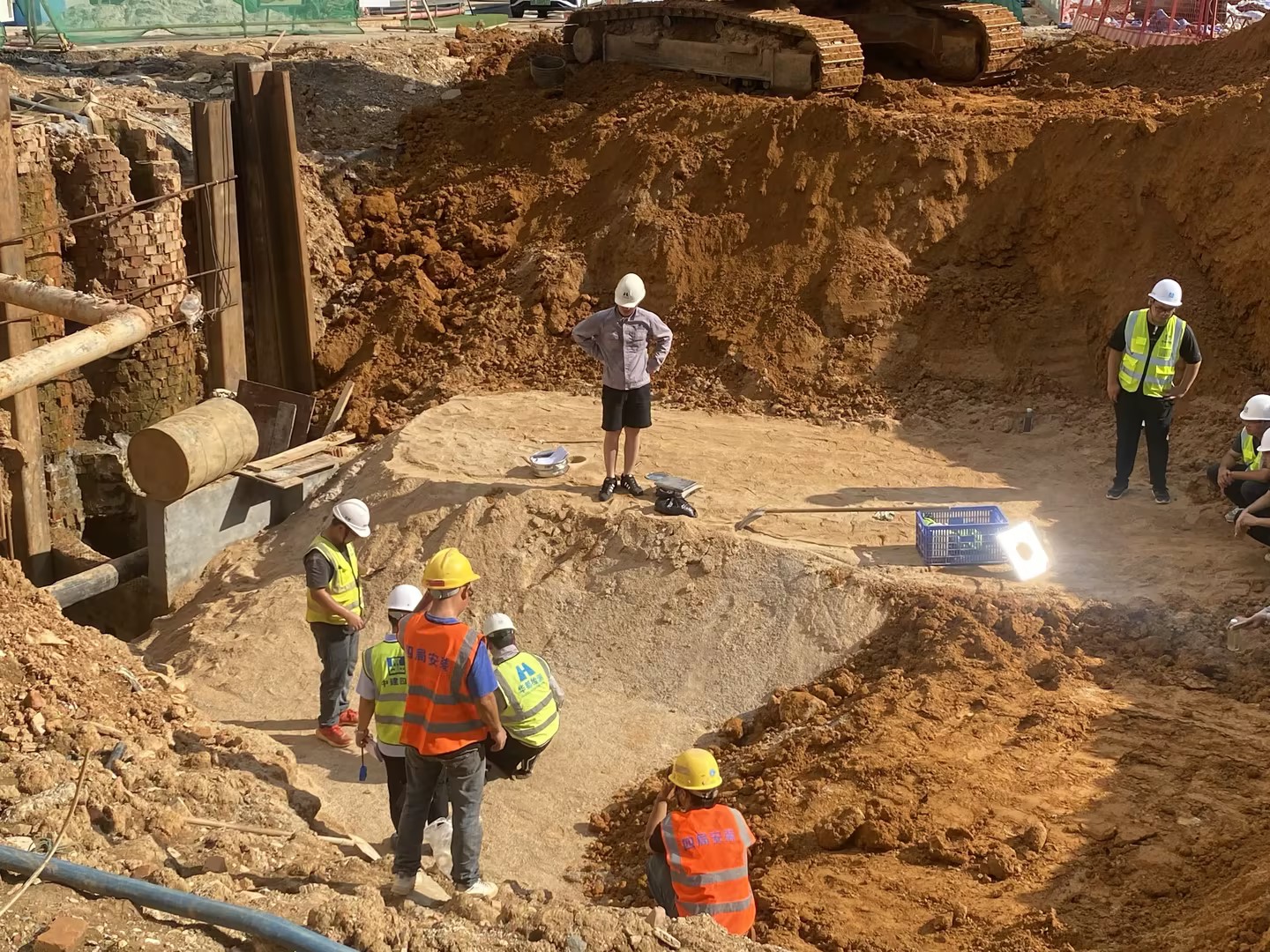 大门段管线迁改土方开挖,雨、污水管道安装并闭水试验合格,中粗砂回填至雨水管顶50cm,土方回填至第一道水平围檩。