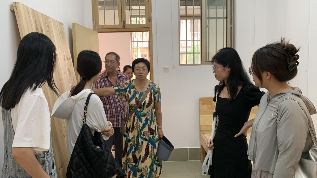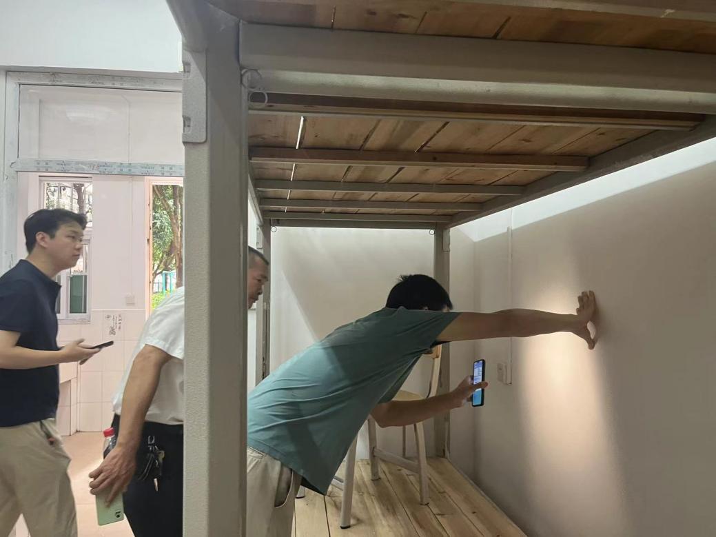 工作人员与施工方检查毕业生腾空房修缮项目