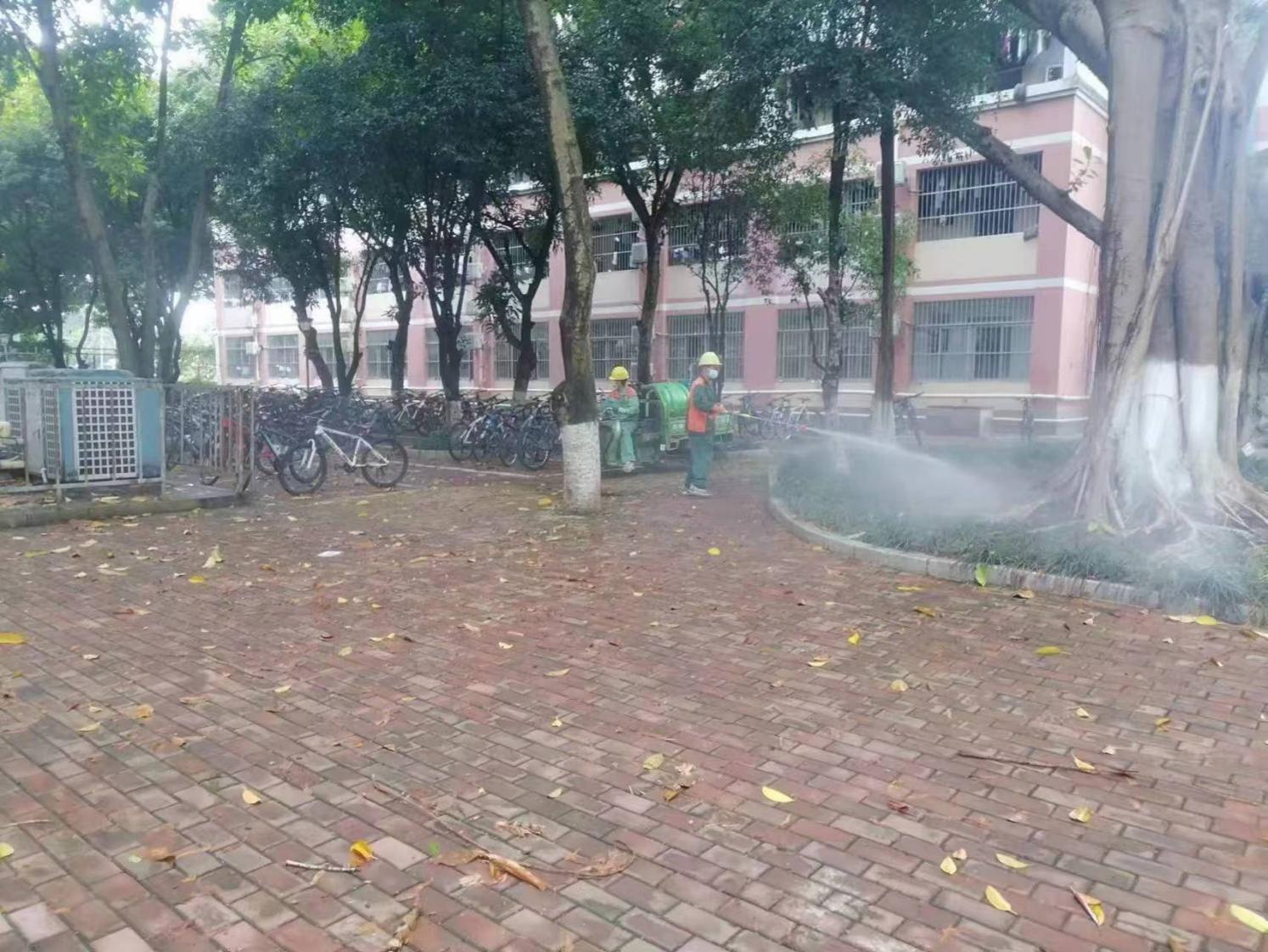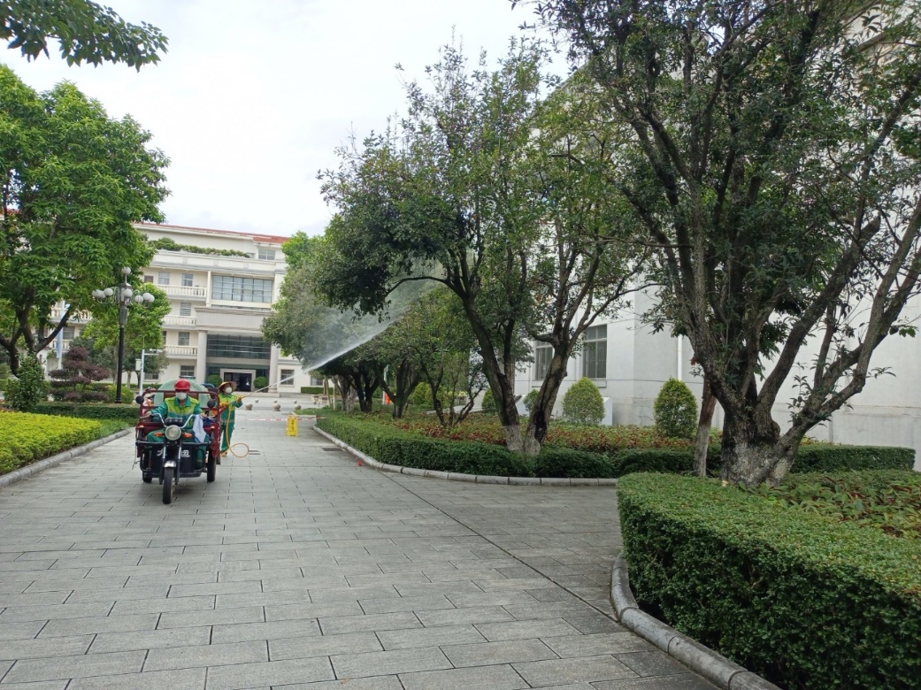2.对公共教学楼宇的楼梯、走廊、门把手、课桌椅、水龙头、楼梯扶手、电梯间及按钮等高频接触表面进行重点杀菌消毒274次。