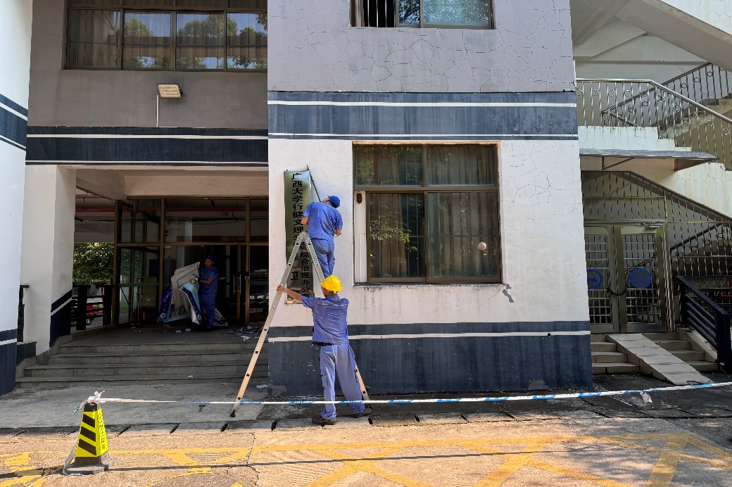 项目概况:学生公寓东31-35栋(原行健3-7号楼),项目投资2462.50万元,修缮面积77905平方米,共2104间宿舍,8400个床位。主要修缮内容:屋面部分防水、室内修补粉刷、部分卫生间翻修、更换阳台护栏、更换入户门及防火门、更换照明灯具、铺设一楼部分地板砖、更换部分空调机外架等。于2024年7月11日开工建设,合同工期50天;但由于施工单位违约,不按合同履行承诺,合同工期满后还有大量施工内容未完工,迫于新生开学的压力,校领导现场督战,8月31日紧急抢出所有室内修缮任务,基本达到入住条,后续继续整改完善。本工程由中外建华诚工程技术集团有限公司设计,中国建筑第六工程局有限公司承建,广西磊鑫建设有限公司监理。