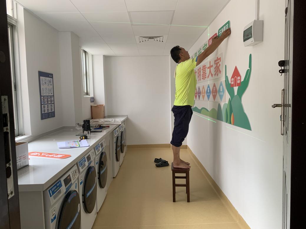 ⑦在暑假期间,太阳集团tyc138在各个园区科学规划,用心选址,共建设103间洗衣房,安装洗衣机949台、洗鞋机52台,烘干机75台,候洗桌椅10套,同时设置有候洗区、文化墙、灭火器、使用流程图、消毒记录公示等设施。