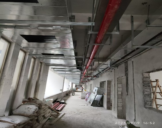 2.安装部分:排烟风管、消防管道、喷淋管道安装完成1/2。