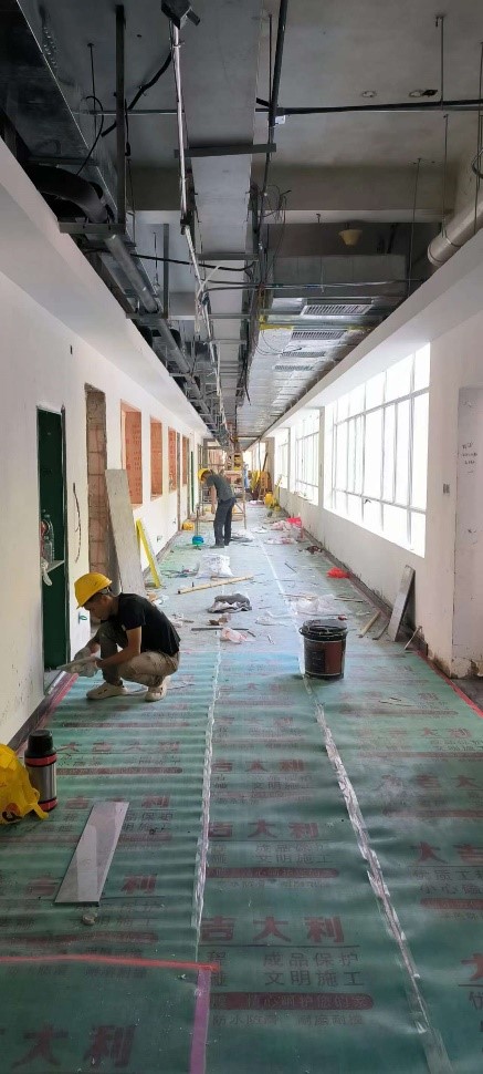 (1)土建部分:已完成旧地面、墙面、屋面等装饰层的拆除及清运工作;墙体砌筑、抹灰、腻子已完成,待刷涂料; 屋面完成找坡层、防水层和隔热层;地面砖铺贴完80%;卫生间做好防水层,开始铺贴卫生间瓷砖。