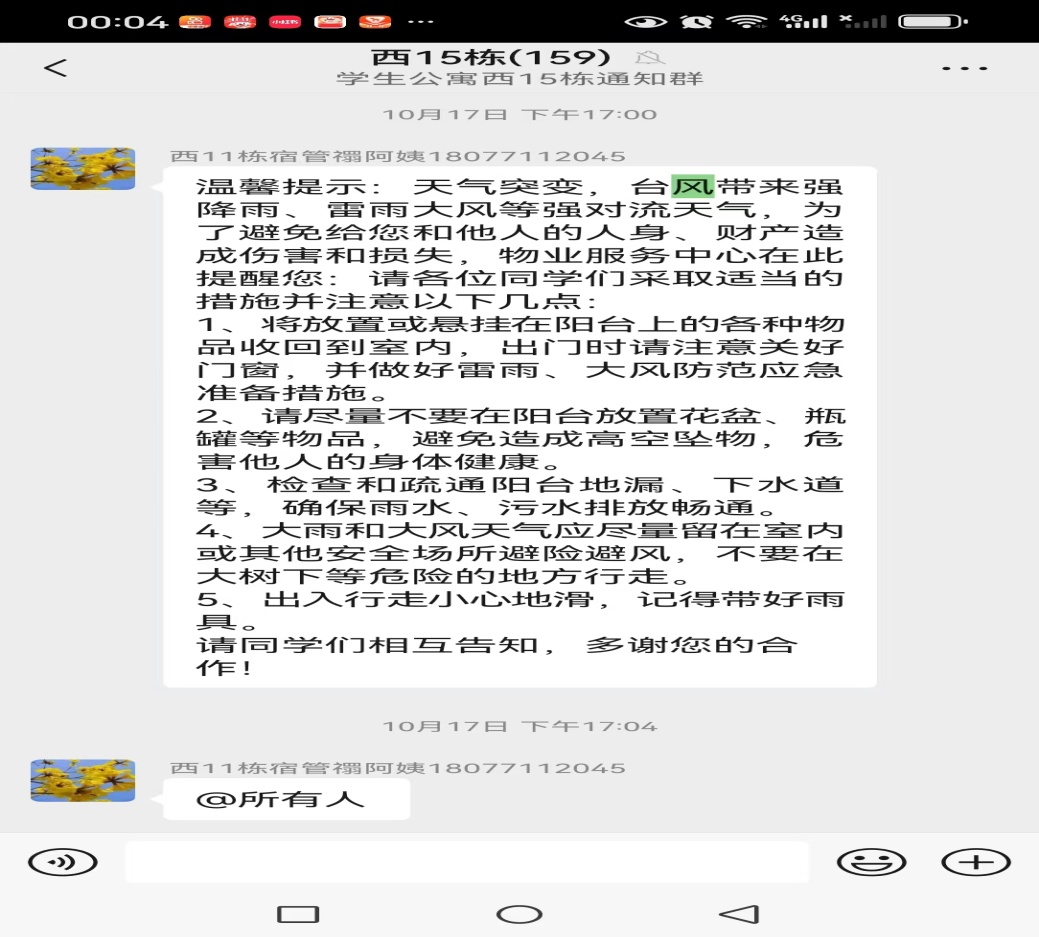 2.日常管理工作:日常工作中注重服务细节,做到“马上到、马上做、马上改”,事事有回应、事事有结果。本月帮助学生解决天面漏水、热水等问题共15起。
