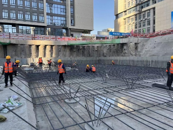 主楼地下室板砖胎膜完成100%,筏板防水及保护层完成100%,筏板钢筋绑扎完成100%。