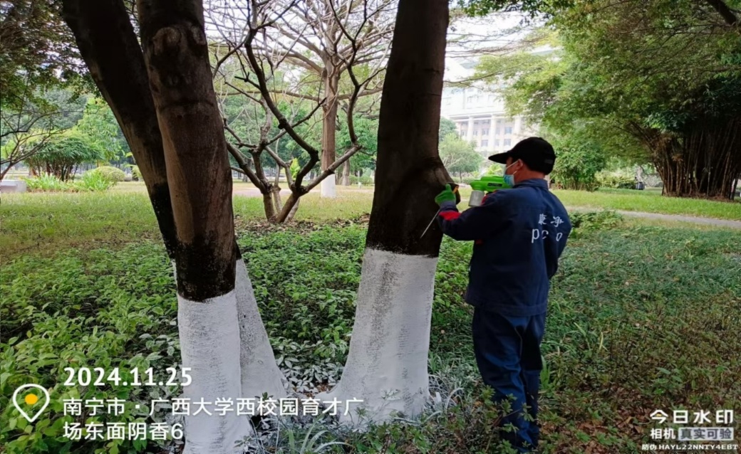 绿化养护工作主要对校内绿地草坪进行修整及落叶杂草清理;对教学区域、办公区域等植物进行浇灌、施肥、病虫害防治;对校内各区域树木危枯枝、垂枝、寄生树进行修剪及对缠绕树木绿植的菟丝子的进行清除;对校内各区域危树死树进行巡查及处理,并做好校园各区域绿地盆栽淋水等工作。