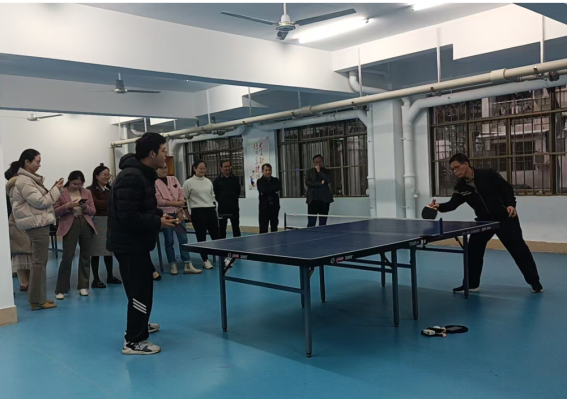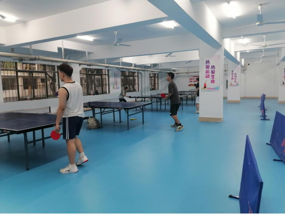 校党委常委、副校长宁旭初在学生公寓乒乓球馆与学生开展乒乓球运动