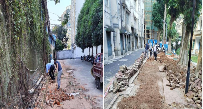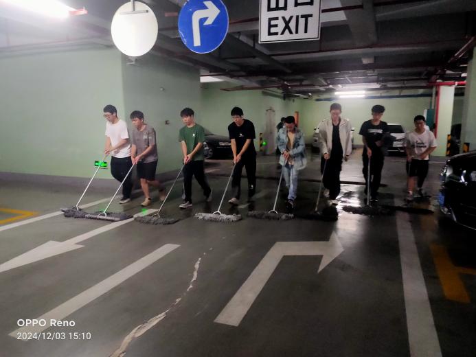 教职工生活区公共区域及宿舍楼楼道做好清扫保洁工作,楼栋内地面、墙面、楼梯扶手、电梯内及东高地下停车场等区域的卫生整理;持续对墙面小广告及楼道内、水电井房乱堆乱放的杂物进行巡查清理,保持消防通道畅通,消除安全隐患。
