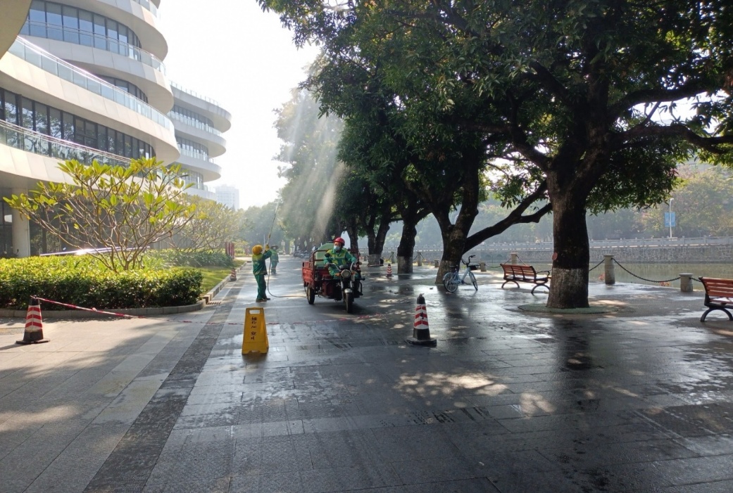 校园环境卫生保障工作继续正常有序开展。环卫员工每日对校园内各主支干道、教职工住宅区公共区域、楼道等进行清扫保洁,对道路雨箅子、排水沟加强巡查并及时清掏淤泥和垃圾,清除绿化带草地的石块、杂物、白色垃圾和树木下的枯枝落叶,清除灯杆小广告;清洗校园路牌、休闲座椅、凉亭和雕像,保持校园环境干净整洁;按规定时间路线清运校园垃圾,做到垃圾日产日清,并将垃圾回收至垃圾中转站进行除臭处理,并定期清洗垃圾桶、垃圾箱和垃圾桶周边污垢,保证无异味产生;继续进行垃圾分类督导宣传,发放垃圾分类宣传单,提高师生垃圾分类意识。还完成国际标准化组织钢-混凝土组合结构和混合结构分委会(ISO/TC 71/SC 9)秘书处揭牌、中央财办来校调研、太阳集团tyc138第54届运动会、自治区机关事务管理局到校调研等多项活动的环境卫生保障工作。
