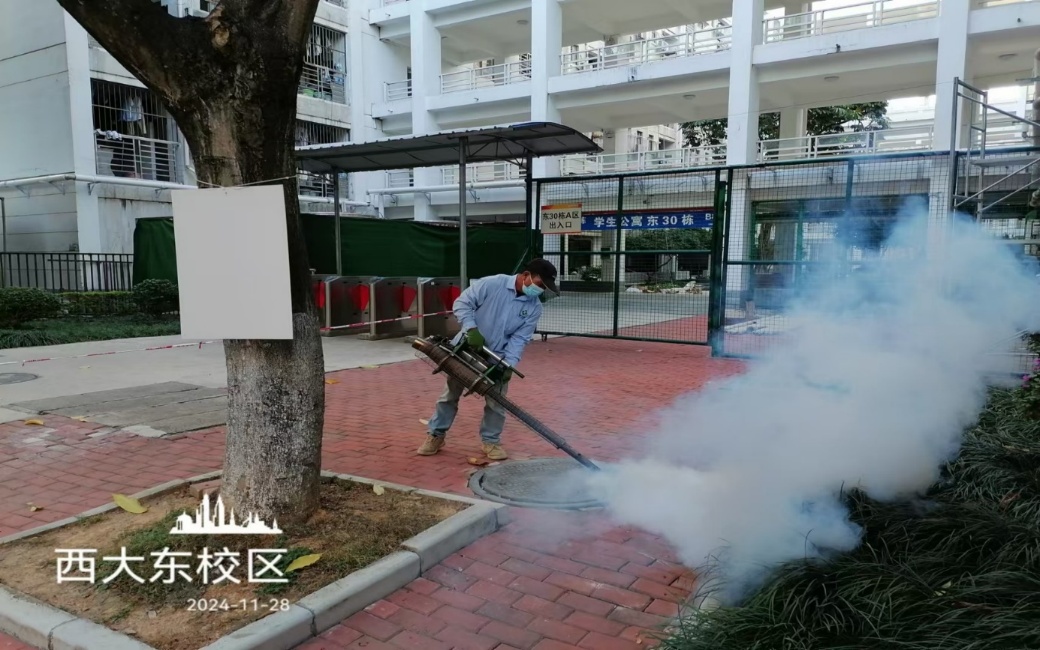 为保持良好的校园卫生环境,病媒生物防治板块已于2024年11月22日—12月3日对东、西校园和行健文理学院的教学办公区、教职工住宅区、学生公寓区等外环境实施新一轮灭鼠杀虫、白蚁、红火蚁等病媒生物防治工作。防治范围包括所有的教学楼、办公楼、教职工住宅楼、食堂、农贸市场、医院、科研基地、仓库等外环境以及校园的主次干道的下水道口、公厕、垃圾桶(箱)、绿化带、雨水沟等,实际有害生物防治面积约136万㎡。其中绿地30多万㎡,下水道、化粪池及各类地井约3500个、小型污积水体约1万㎡,防治的主要内容包括对上述区域外环境的鼠、蚊、蝇、蟑螂等病媒生物及红火蚁、白蚁进行有效防制。