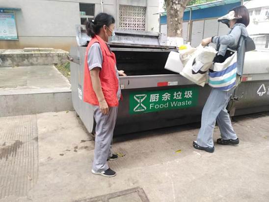 垃圾分类督导员引导同学们分类投放垃圾