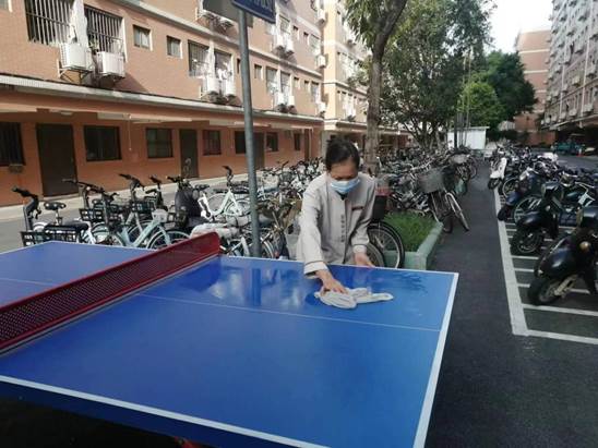 工作人员开展园区乒乓球桌保洁工作