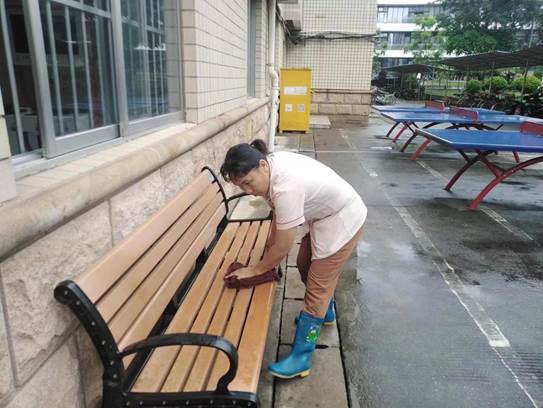 工作人员擦拭园区公共长椅工作