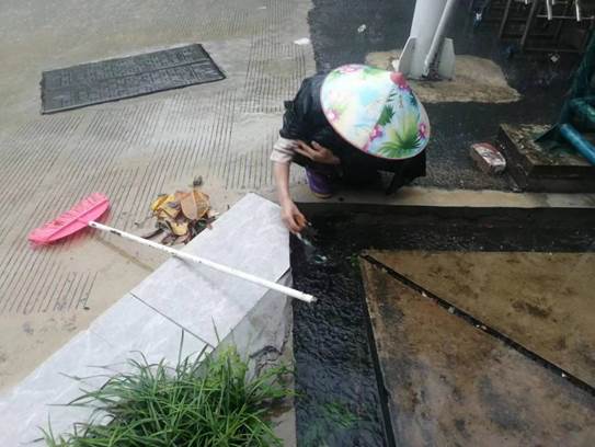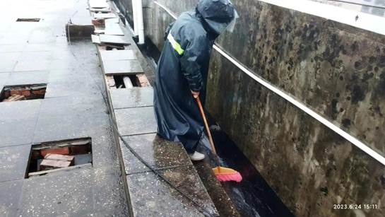 工作人员雨天在公寓楼顶疏通水道