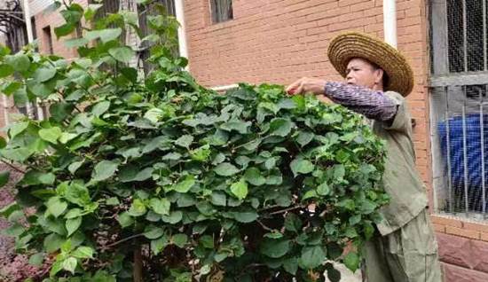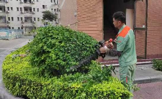 绿化工作人员在西16栋开展修剪三角梅工作