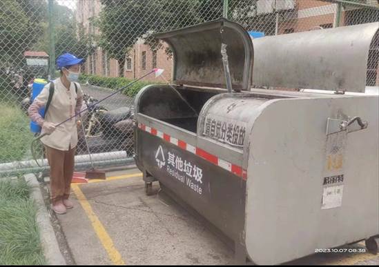 工作人员开展公共区域垃圾桶消毒消杀工作
