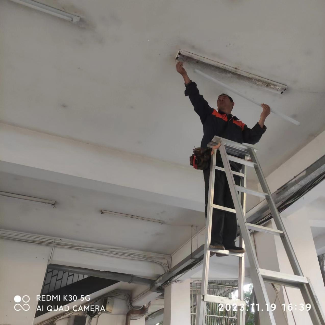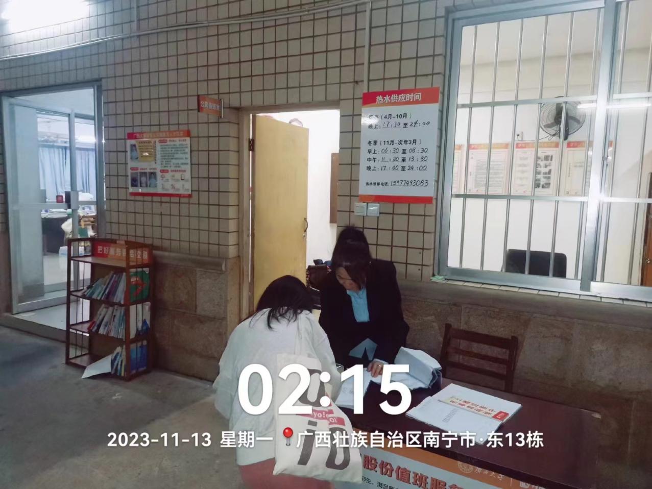 2023年11月11日-17日后勤服务24小时报修中心接电话报修、网上报修、现场报修1467单,其中学生公寓报修1100单(已完工1082单,完工率98.3%,余18单在维修中),其中电气类260单,木工类184单,给排水类360单,基建类37单,冷热水阀类120单,其他类139单,余下367单由其他岗位负责完成维修;在做好每天日常维修的同时,坚持对学生公寓183间电表房, 2个水泵房每天巡检。