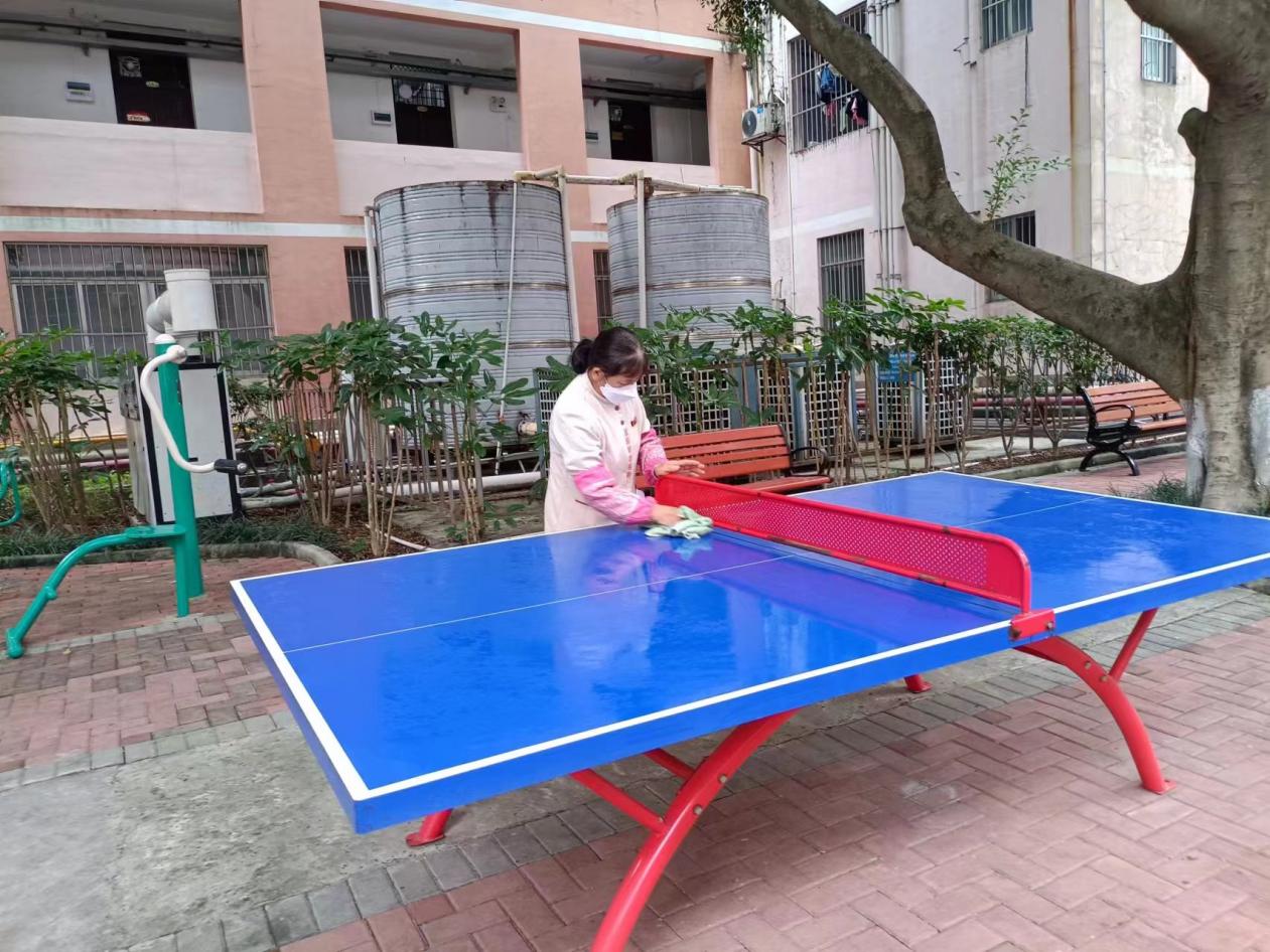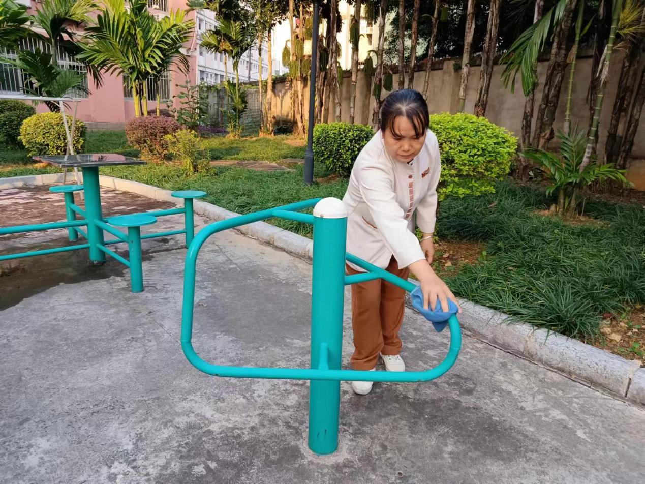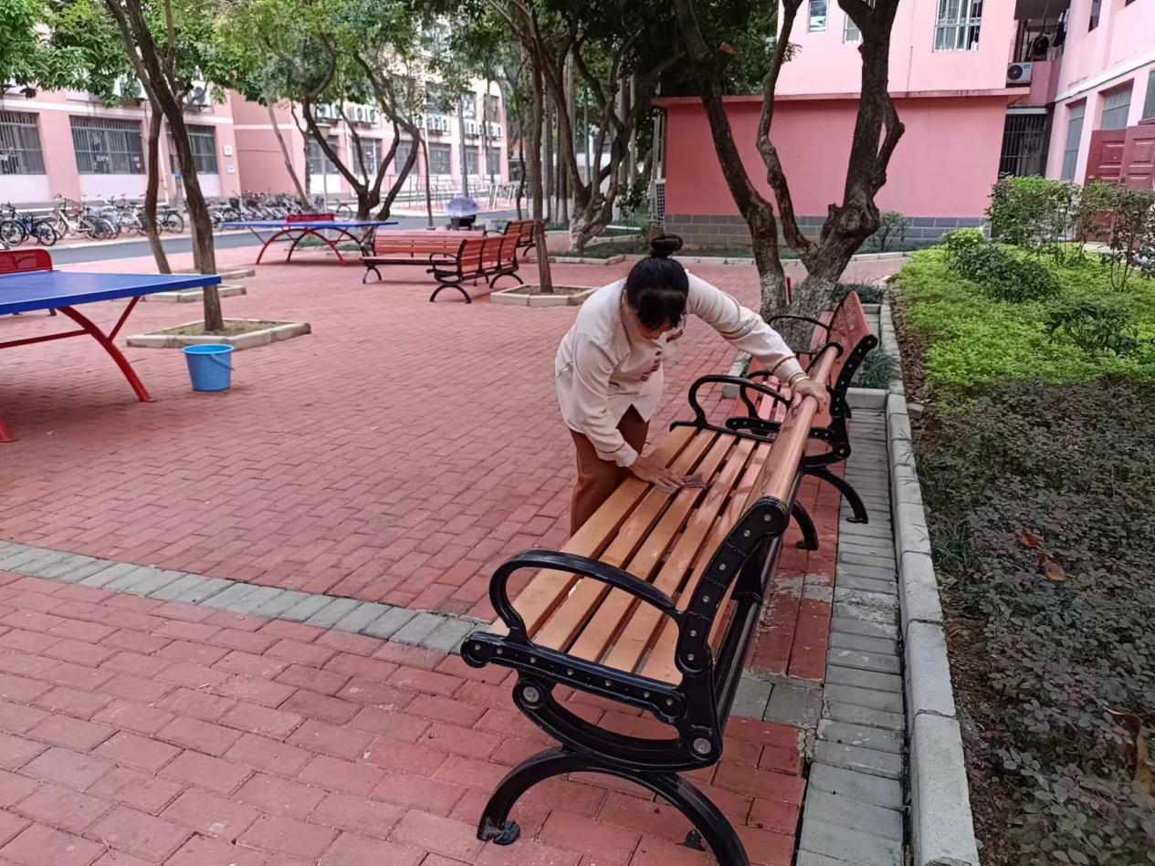 认真做好园区内各种设备设施和33间自习室的保洁维护工作。擦拭学生公寓园区内472个生活设施(其中公共长椅102张,乒乓球桌152张,晾衣架134个、健身器材84个)。