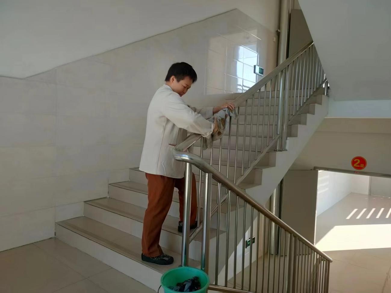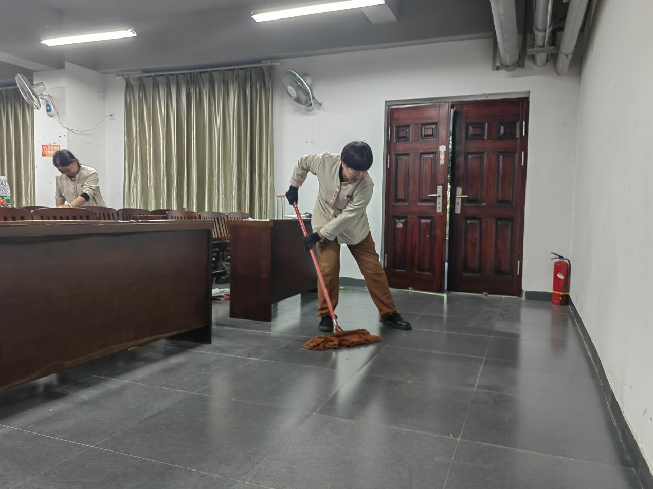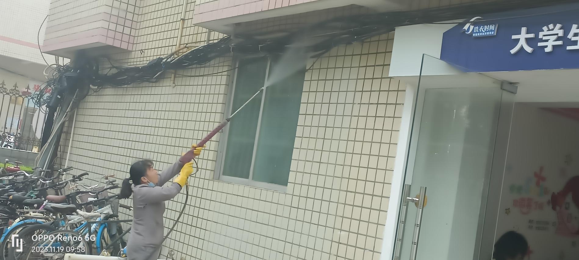 认真做好园区内各种设备设施和33间自习室的保洁维护工作。擦拭学生公寓园区内472个生活设施(其中公共长椅102张,乒乓球桌152张,晾衣架134个、健身器材84个)。